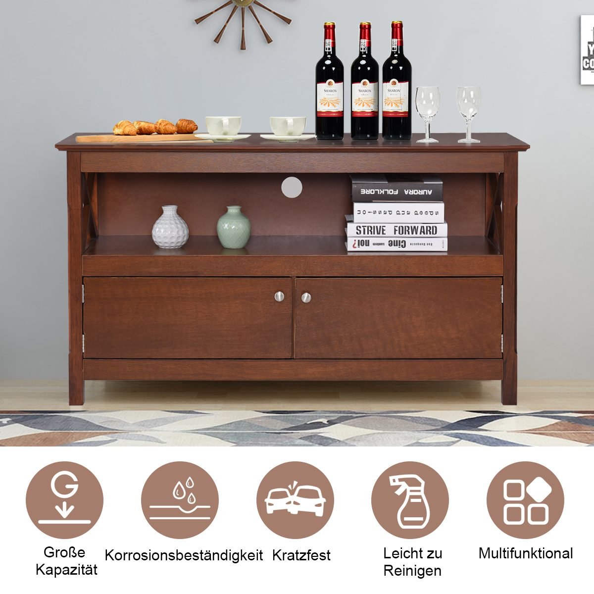 - Daugiafunkcis dizainas: gali būti naudojama kaip TV staliukas arba papildoma laikymo spintelė.