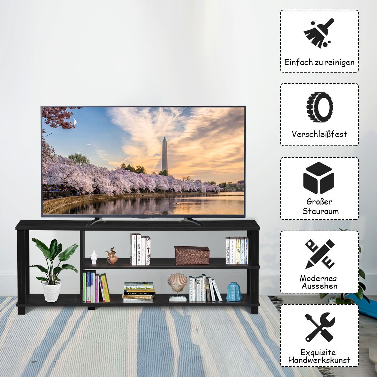 - Trys atviros lentynos puikiai tinka televizoriui, dekoracijoms, augalams, DVD, knygoms ar žaidimų konsolėms laikyti.
