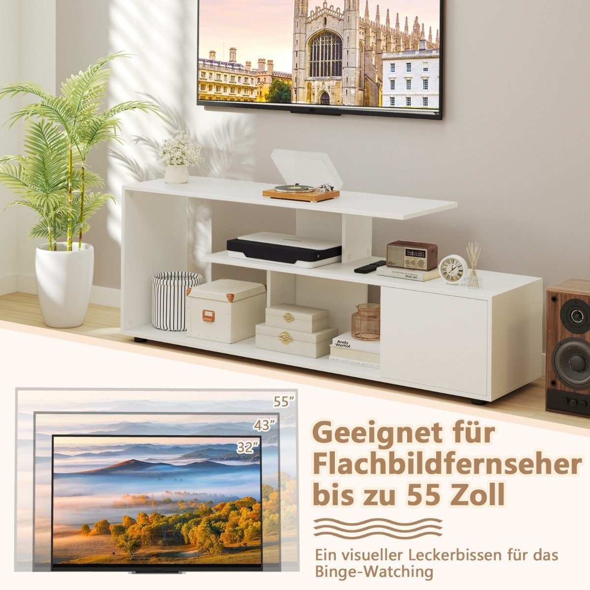 Pagerinkite savo namų pramogų centrą su šiuo stilingu ir funkcionaliu TV stovu. Sukurtas tvirtai laikyti televizorių iki 55 colių, jis siūlo daug vietos jūsų pramogų įrangai ir dekoratyviniams elementams tvarkingai laikyti.