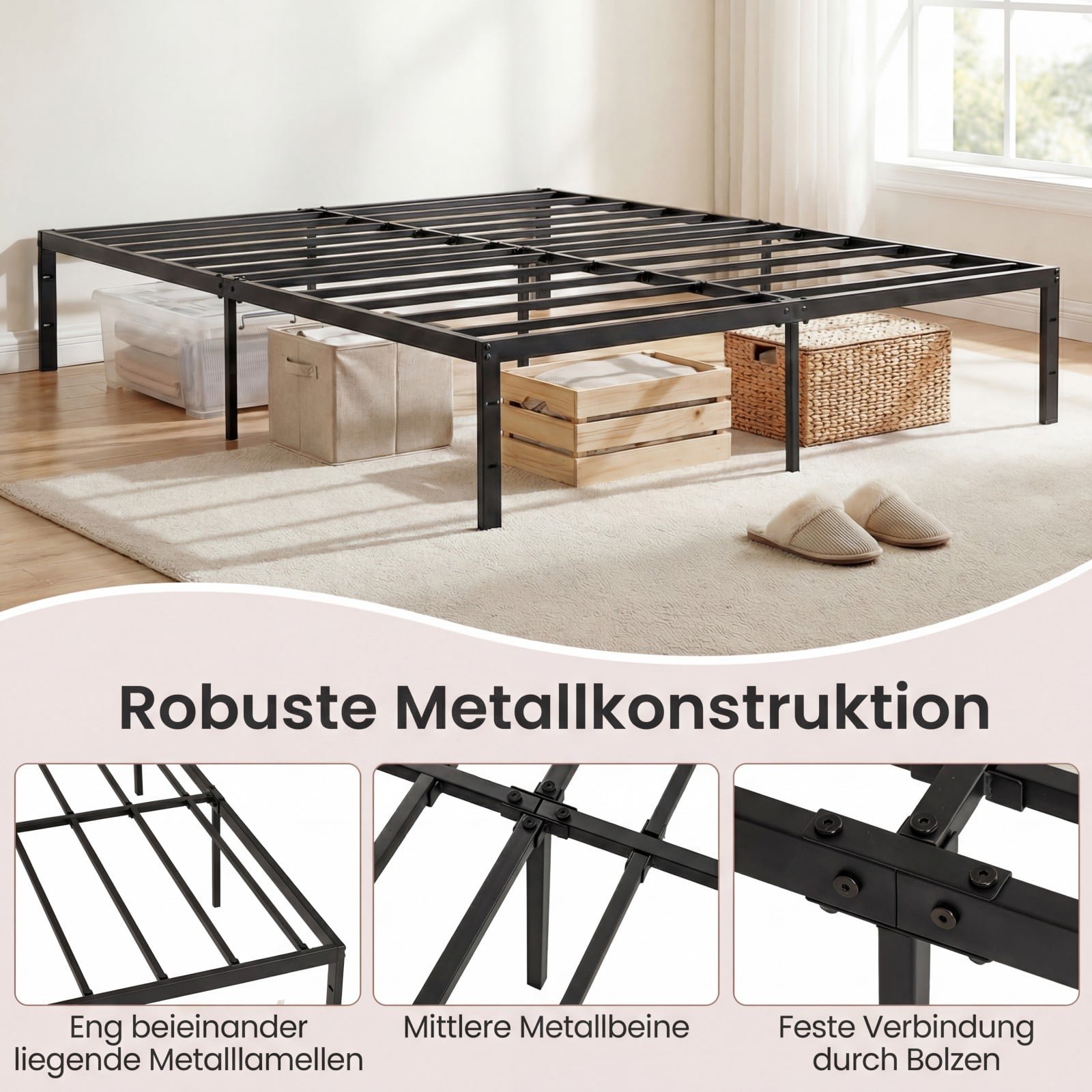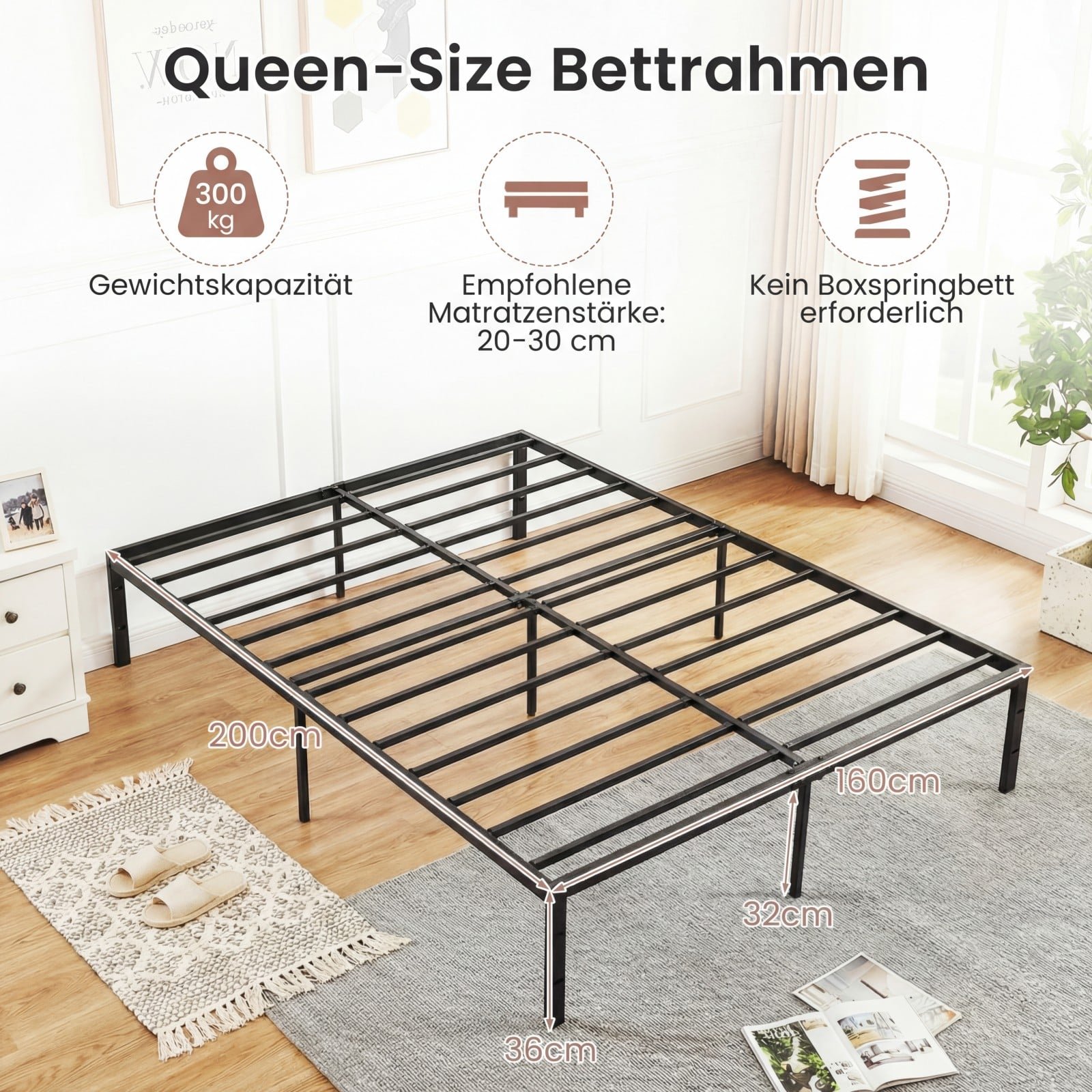 Atnaujinkite savo miegamojo stilių su šiuo metaliniu platforminės lovos rėmu! Pagamintas iš tvirtų metalinių grotelių ir atraminių kojų, rėmas užtikrina išskirtinį stabilumą ir ilgaamžiškumą. Putplasčio paminkštinimai ties pagrindinėmis jungtimis garantuoja tylią ir ramią miego patirtį, o erdvus 32 cm aukščio tarpas po lova suteikia praktiškų daiktų laikymo sprendimų.