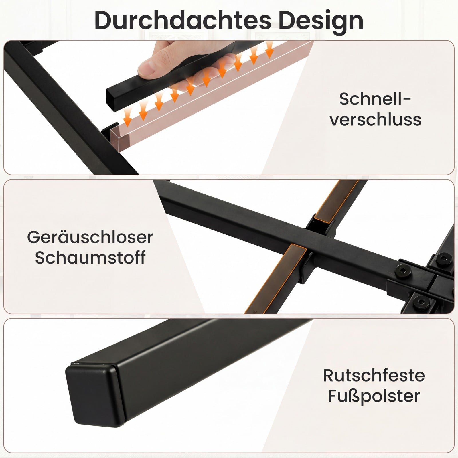 - Paprastas ir greitas surinkimas (visos skylės išgręžtos iš anksto), nereikalaujantis papildomo spyruoklinio čiužinio pagrindo.