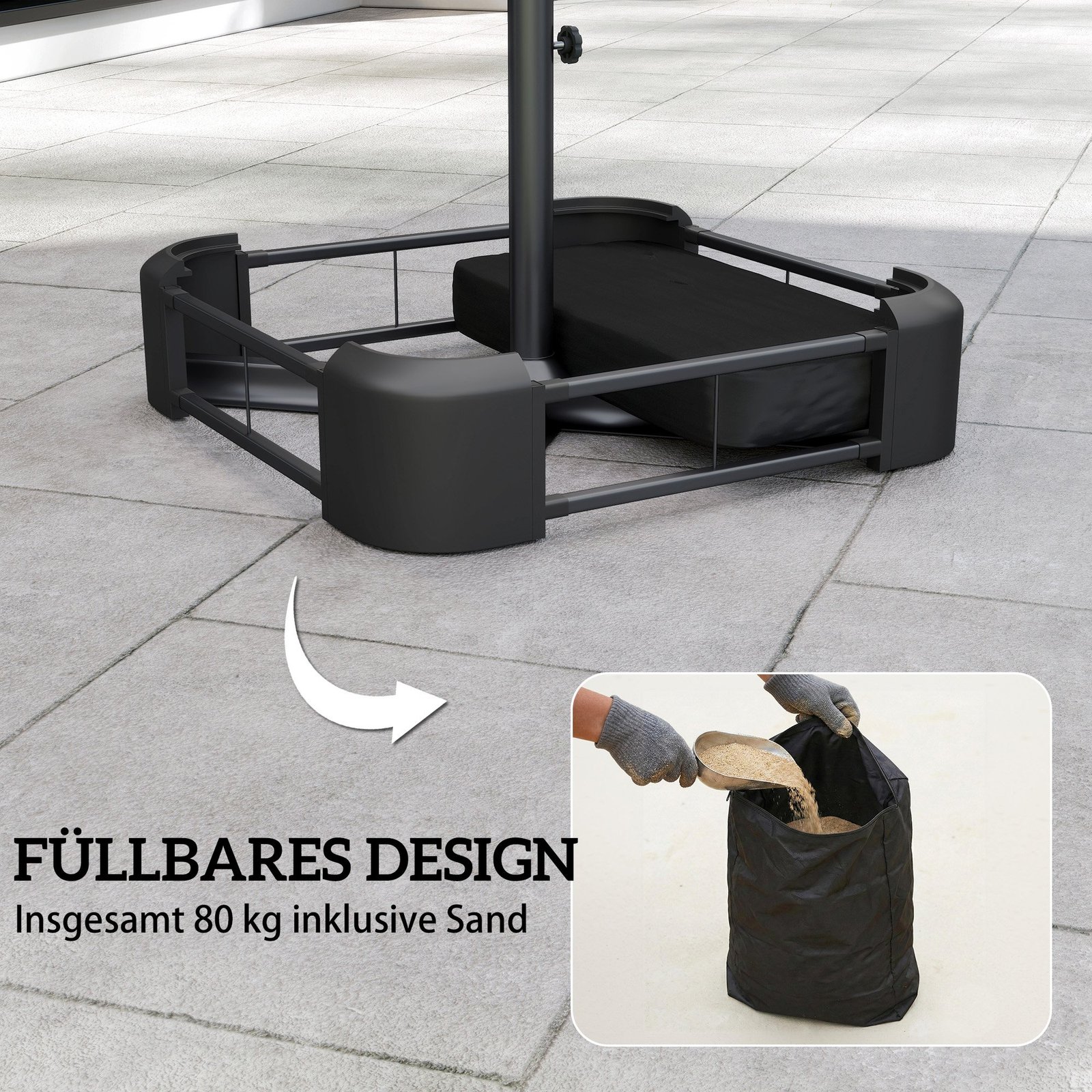 Staigus vėjo gūsis gali apversti jūsų skėtį nuo saulės ir sutrukdyti atsipalaiduoti. Šis skėčio nuo saulės stovas, užpildytas iki 80 kg smėlio arba 90 kg vandens ir smėlio, užtikrina neprilygstamą stabilumą. Jo oro sąlygoms atspari konstrukcija tinka įvairių tipų skėčiams nuo saulės. Su šiuo stovu galėsite be rūpesčių mėgautis lauko erdvėmis bet kokiu oru.
