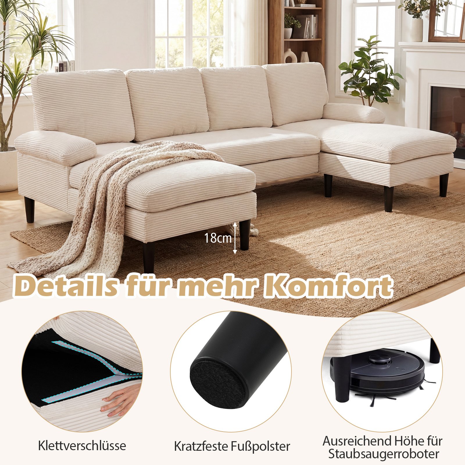 Mėgaukitės nepakartojamu komfortu su šia U formos sofa, pagaminta iš aukštos kokybės, švelnaus audinio, suteikiančio debesų minkštumo pojūtį. Aukšto elastingumo porolonas ir kišeninės spyruoklės užtikrina ilgalaikį palaikymą, o ergonomiškas dizainas su dviem šezlongais puikiai atpalaiduoja nugarą, kaklą ir kojas. Tai ideali vieta šeimos filmų vakarams ar jaukiems vakarams su knyga.