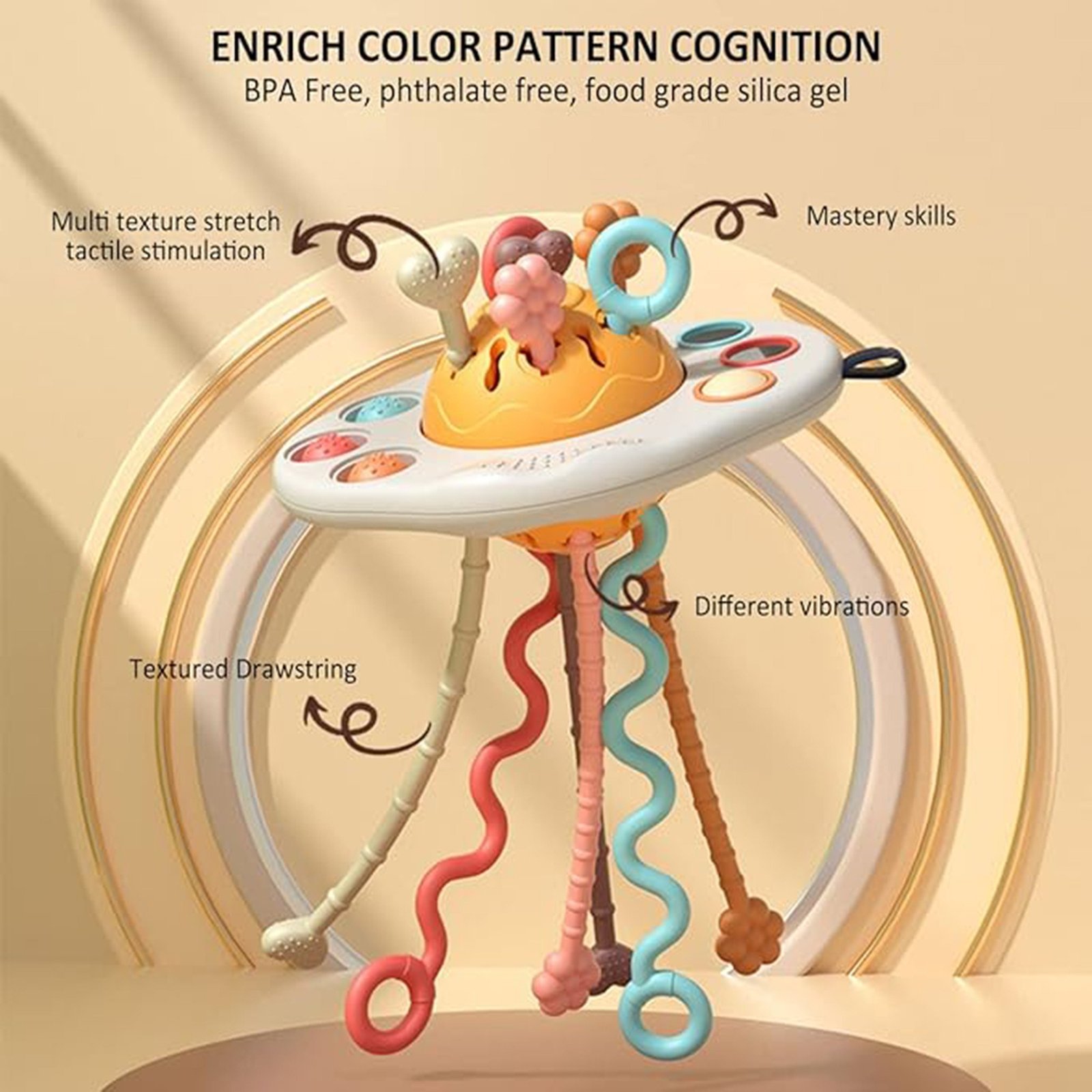 WOOPIE UFO formos sensorinis kramtukas-tempukas yra ne tik smagi pramoga, bet ir padeda skatinti kūdikio vystymąsi. Jis skatina pažinti pasaulį per pojūčius, lavina koordinaciją ir motoriką bei malšina dygstančių dantukų sukeliamą diskomfortą. Žaislą sudaro spalvotos, saugios ir mažoms rankytėms patogios virvelės su įvairiomis tekstūromis, skatinančiomis veikti, tyrinėti ir palengvinančiomis dantukų dygimą. Traukdamas virveles, kūdikis girdės įvairius garsus ir jaus vibracijas. Be to, žaislas turi keletą minkštų mygtukų, kurie vilioja liesti ir spausti. Jų pakelta padėtis žadina vaiko smalsumą ir lavina mažųjų pirštukų miklumą. Šis sensorinis kramtukas derina pramogą ir mokymąsi, padėdamas užtikrinti sveiką vaiko vystymąsi ir siūlydamas valandas įtraukiančių žaidimų.