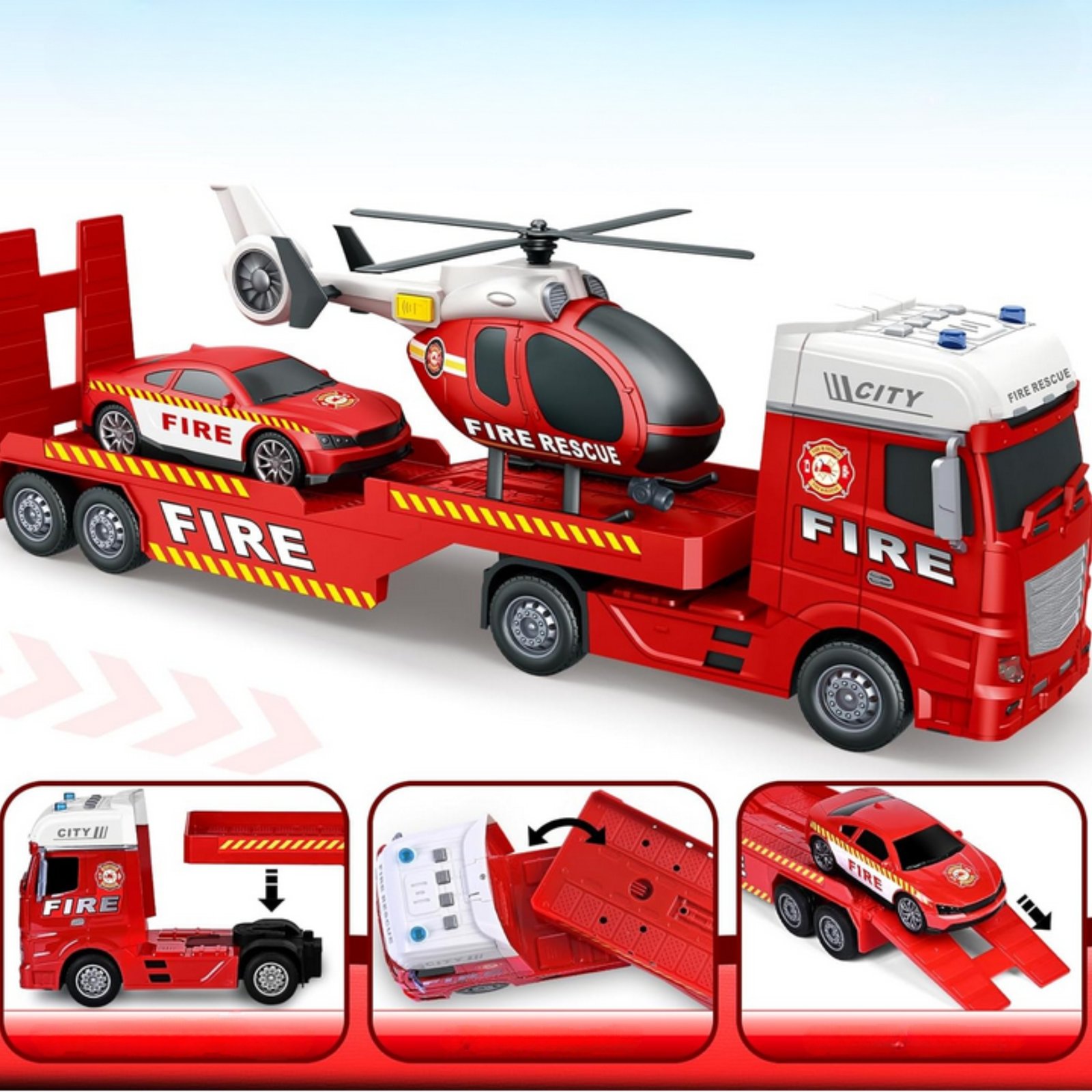 Kiekviena rinkinio detalė pagaminta iš patvarių, saugių ir vaikams draugiškų medžiagų, atsparių intensyviam naudojimui. Todėl žaislas ne tik vizualiai patrauklus, bet ir funkcionalus bei ilgaamžis. Rinkinį sudaro klasikinės ir vaikų mėgstamos transporto priemonės: evakuatorius, kuriuo galima transportuoti kitas mašinėles; sraigtasparnis su realistiškai besisukančiu sraigtu; ir ugniagesių mašinėlė. Tiek evakuatorius, tiek sraigtasparnis turi mygtukais aktyvuojamas šviesos ir garso funkcijas.