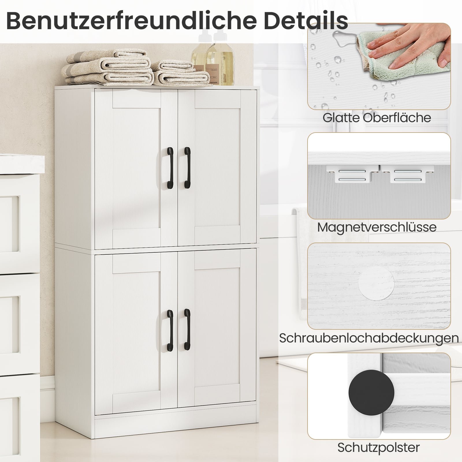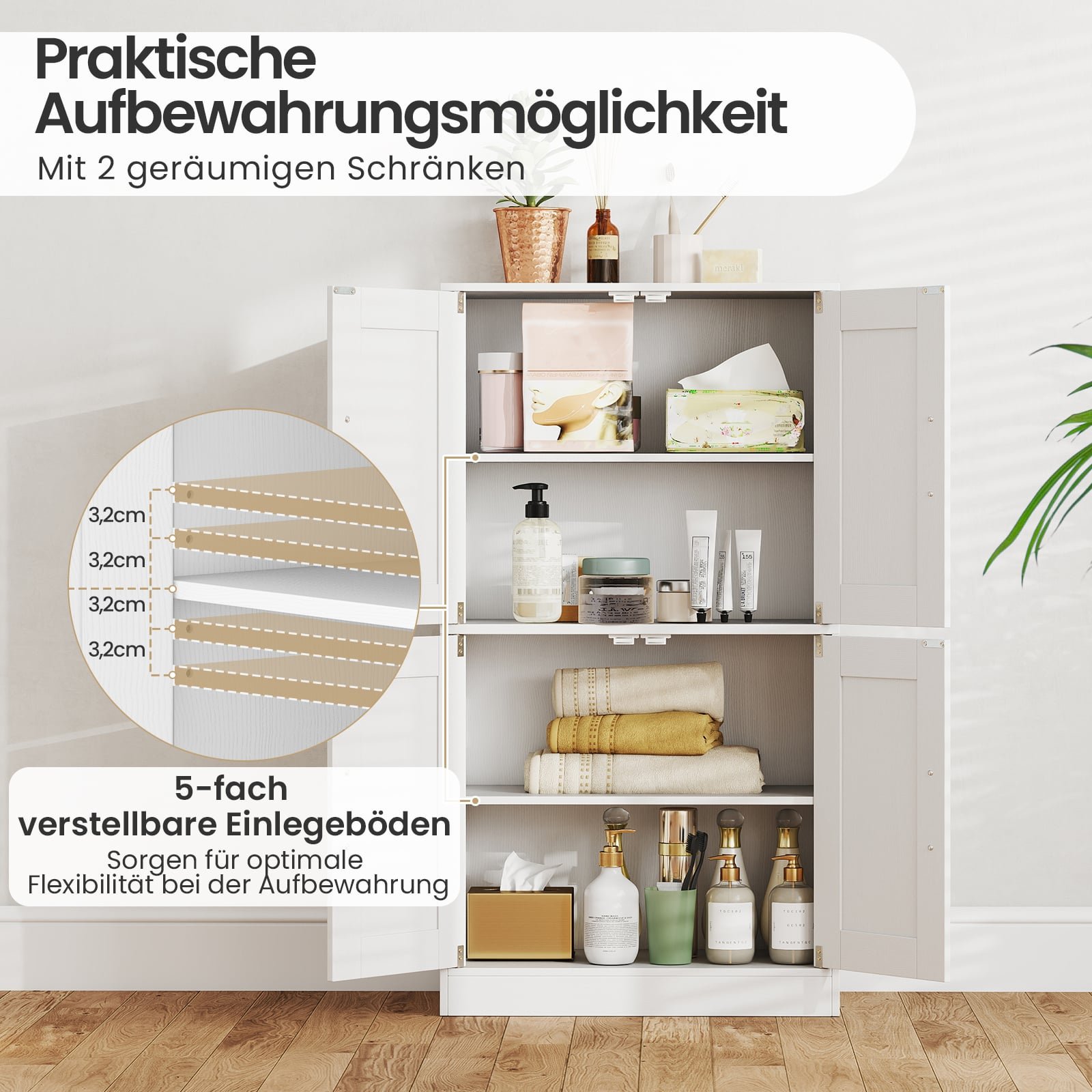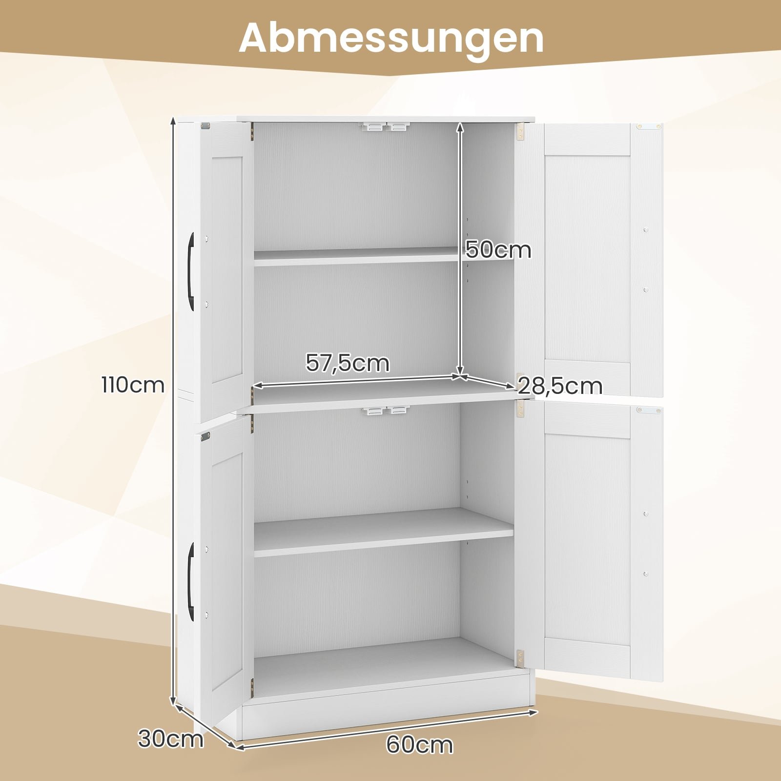 Universali keturių durų spintelė su reguliuojamomis lentynomis (Balta)