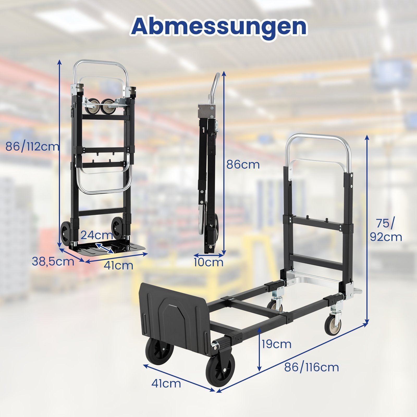 Šis universalus, trys viename sulankstomas vežimėlis – puikus sprendimas sunkiems kroviniams transportuoti. Jis lengvai transformuojasi iš kompaktiškos sulankstytos padėties į 2 ratų rankinį vežimėlį (iki 135 kg) arba 4 ratų transportavimo vežimėlį (iki 272 kg). Dėl tvirto metalinio rėmo, ištraukiamos rankenos ir reguliuojamo ilgio, jis puikiai tinka perkraustymui, apsipirkimui ar kasdienėms užduotims namuose, biure ar sandėlyje. Sukurtas atsižvelgiant į ilgaamžiškumą ir patogumą, šis vežimėlis užtikrina patikimą ir efektyvų krovinių gabenimą.