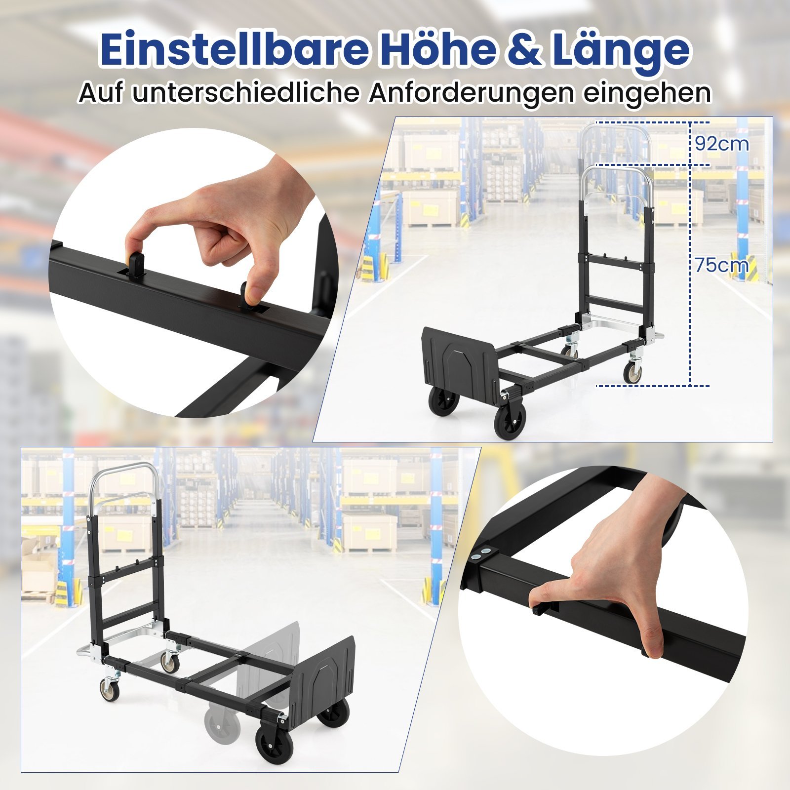 - Ištraukiama rankena ir reguliuojamas platformos ilgis užtikrina patogumą ir lankstumą gabenant įvairaus dydžio krovinius.