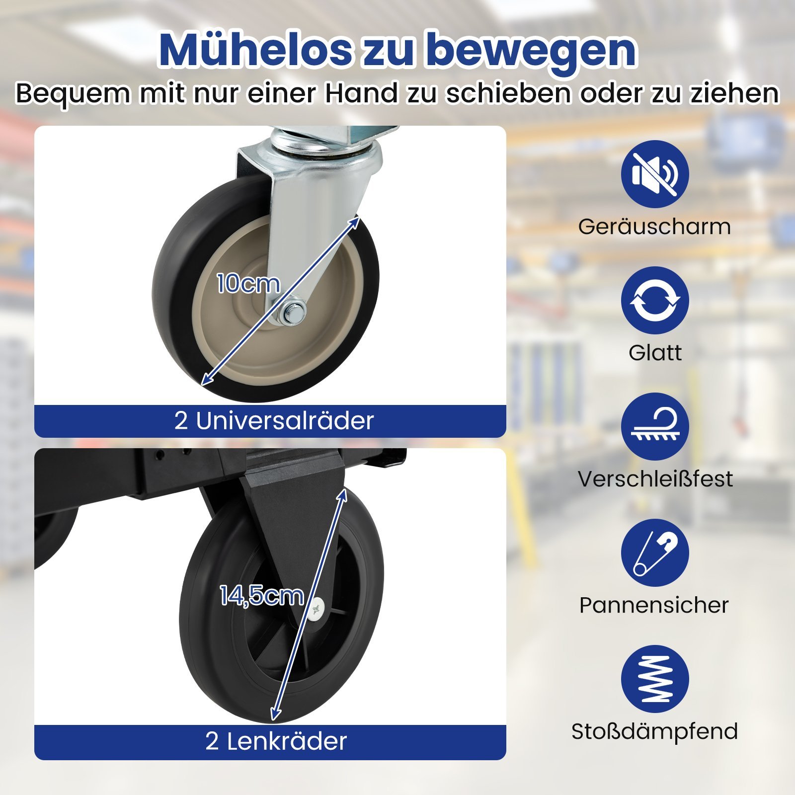 - Tylūs, dilimui atsparūs ir smūgius sugeriantys ratai garantuoja sklandų ir lengvą judėjimą įvairiais paviršiais.