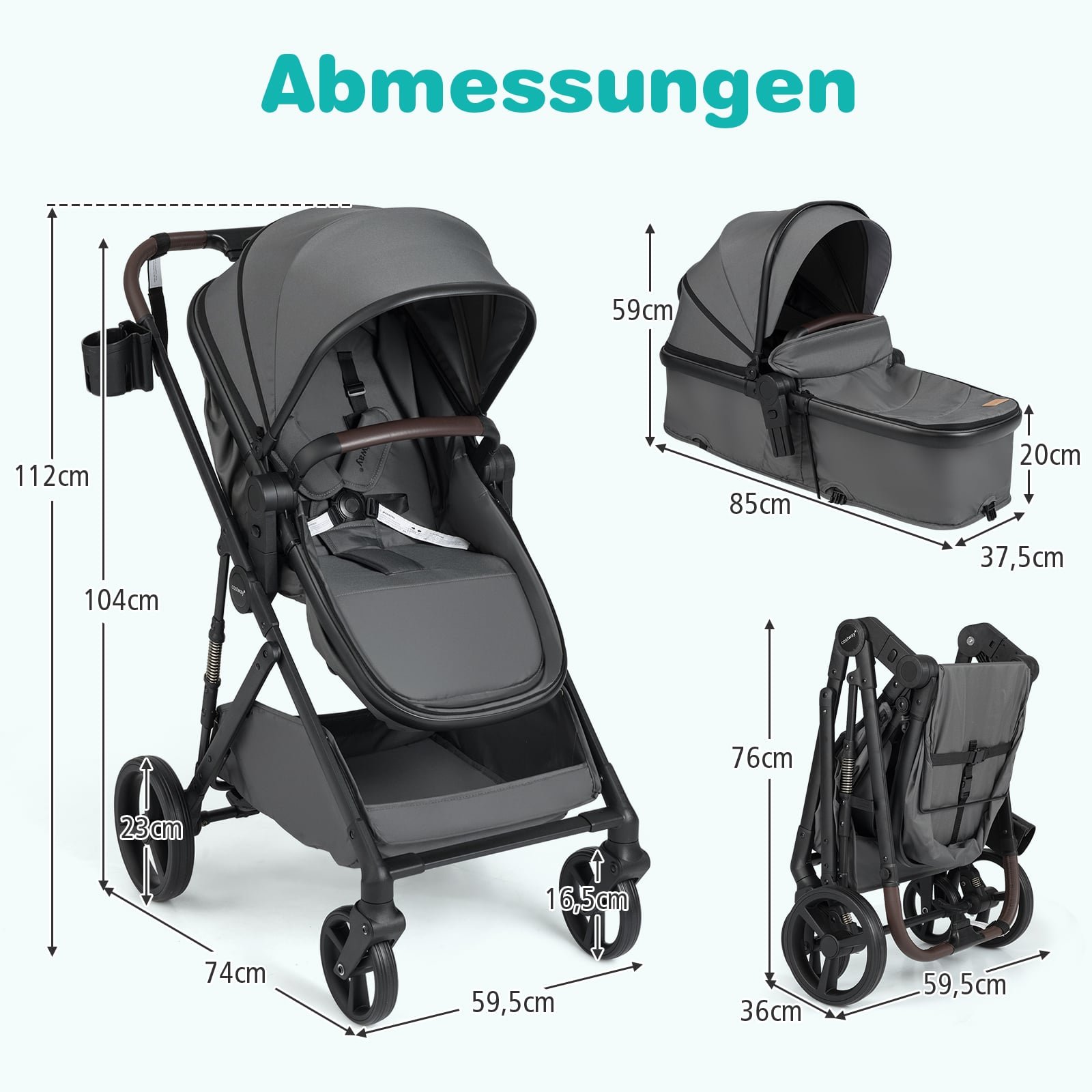- Sulankstyto vežimėlio matmenys: Ilgis x Plotis x Aukštis: 59,5 x 36 x 76 cm (I x P x A)