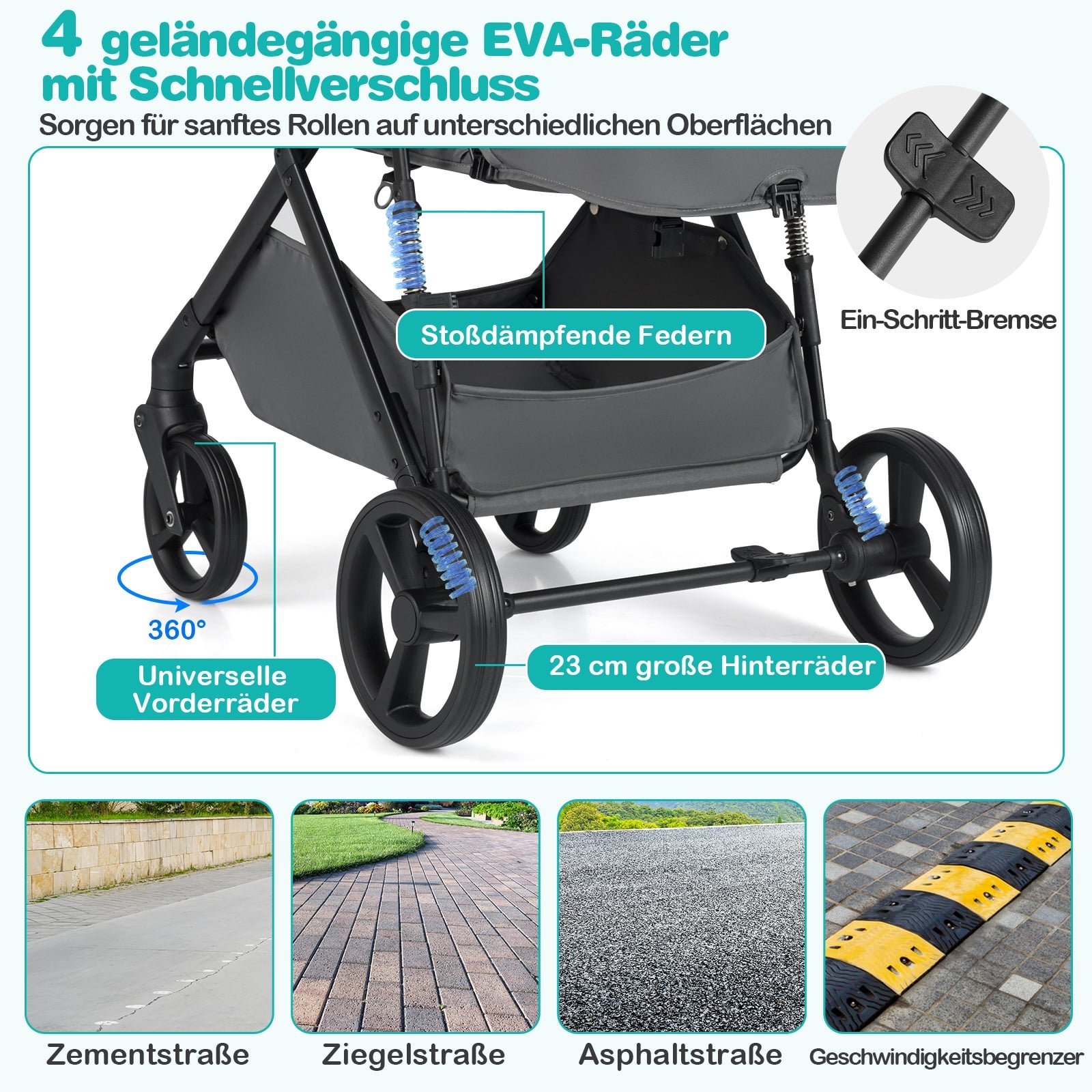 - Sklandus ir saugus važiavimas: Dideli EVA ratai su amortizatoriais garantuoja stabilų ir sklandų važiavimą įvairiais paviršiais, o greito reagavimo stabdys užtikrina greitą ir saugų sustojimą.