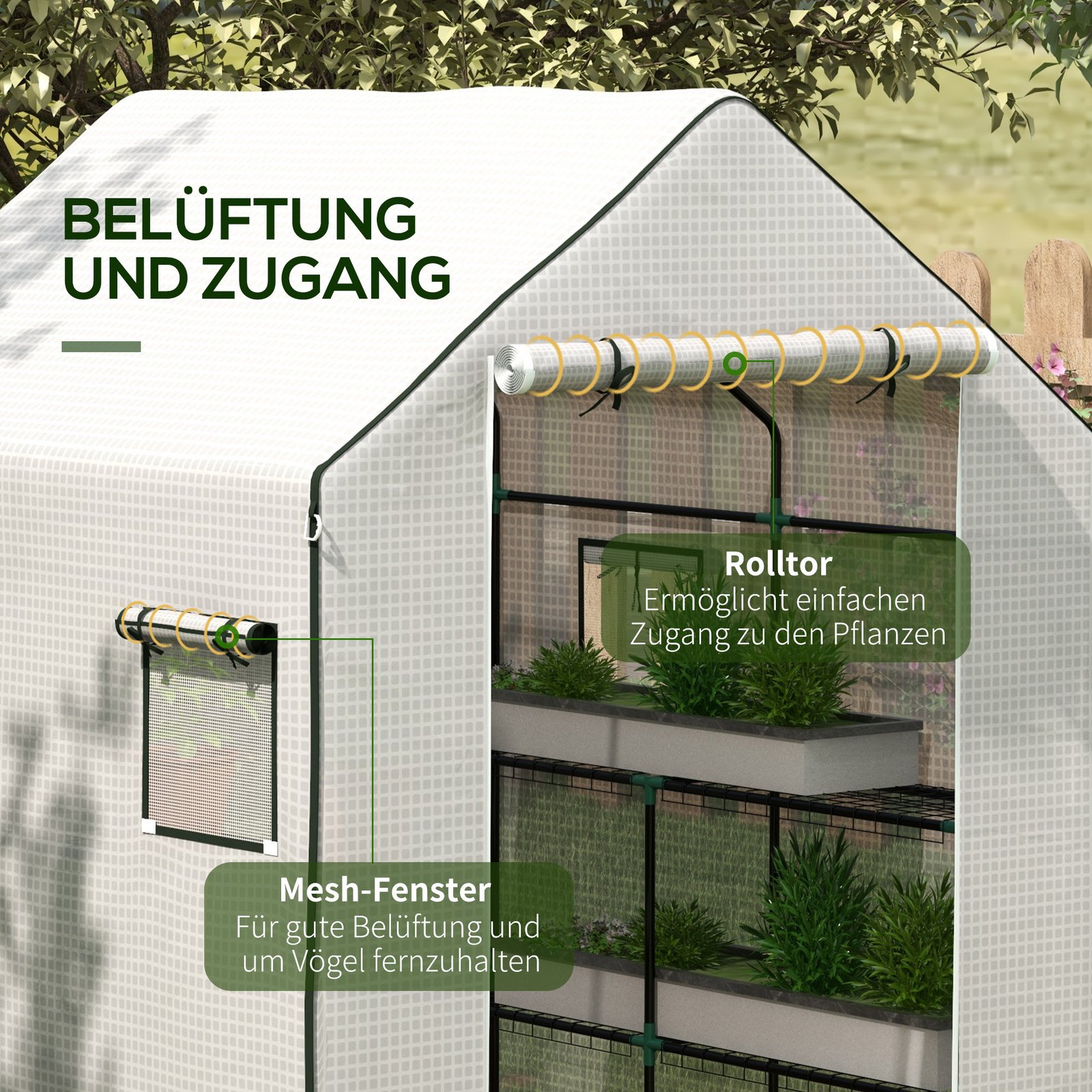 ✔ Susukamos durys ir tinkliniai pomidorų namelio plėvelės langai lengvam priėjimui ir geresniam skersiniam vėdinimui, skirtam temperatūrai ir drėgmei kontroliuoti