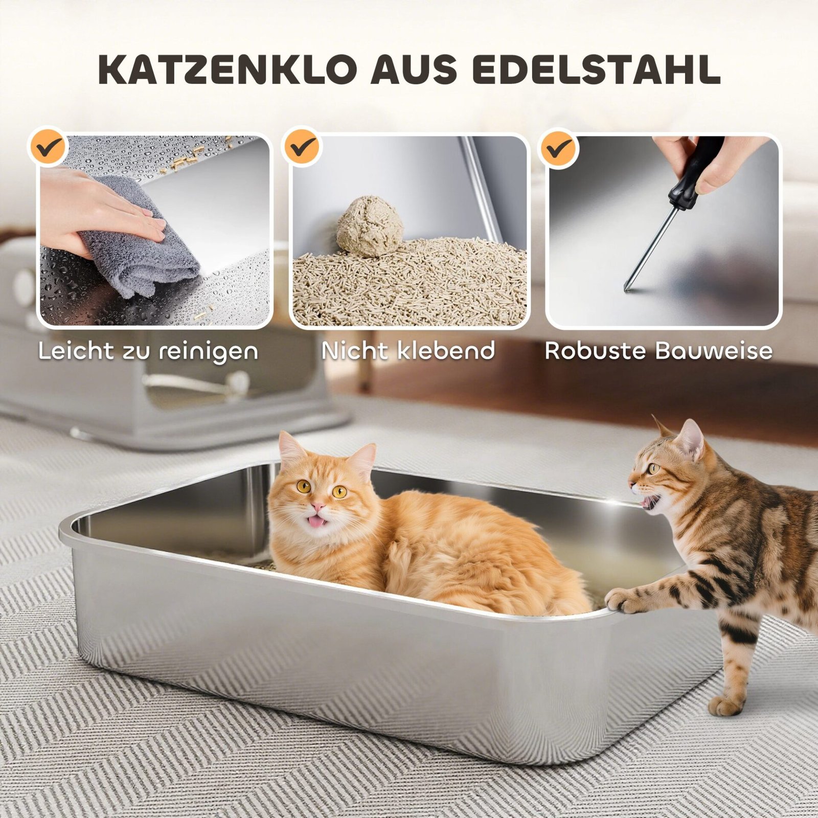 Ši nerūdijančio plieno kačių kraiko dėžė sukurta katėms iki 12 kg ir, būdama XXL dydžio, suteikia daug erdvės, kad būtų išvengta ankštumo. Pagaminta iš patvaraus 201 nerūdijančio plieno, ji yra atspari įbrėžimams, dėmėms ir kvapams. 90° atlenkiamas kačių kraiko dėžės dangtis palengvina valymą, taupo jūsų laiką ir pastangas bei užtikrina švarius, be streso namus.