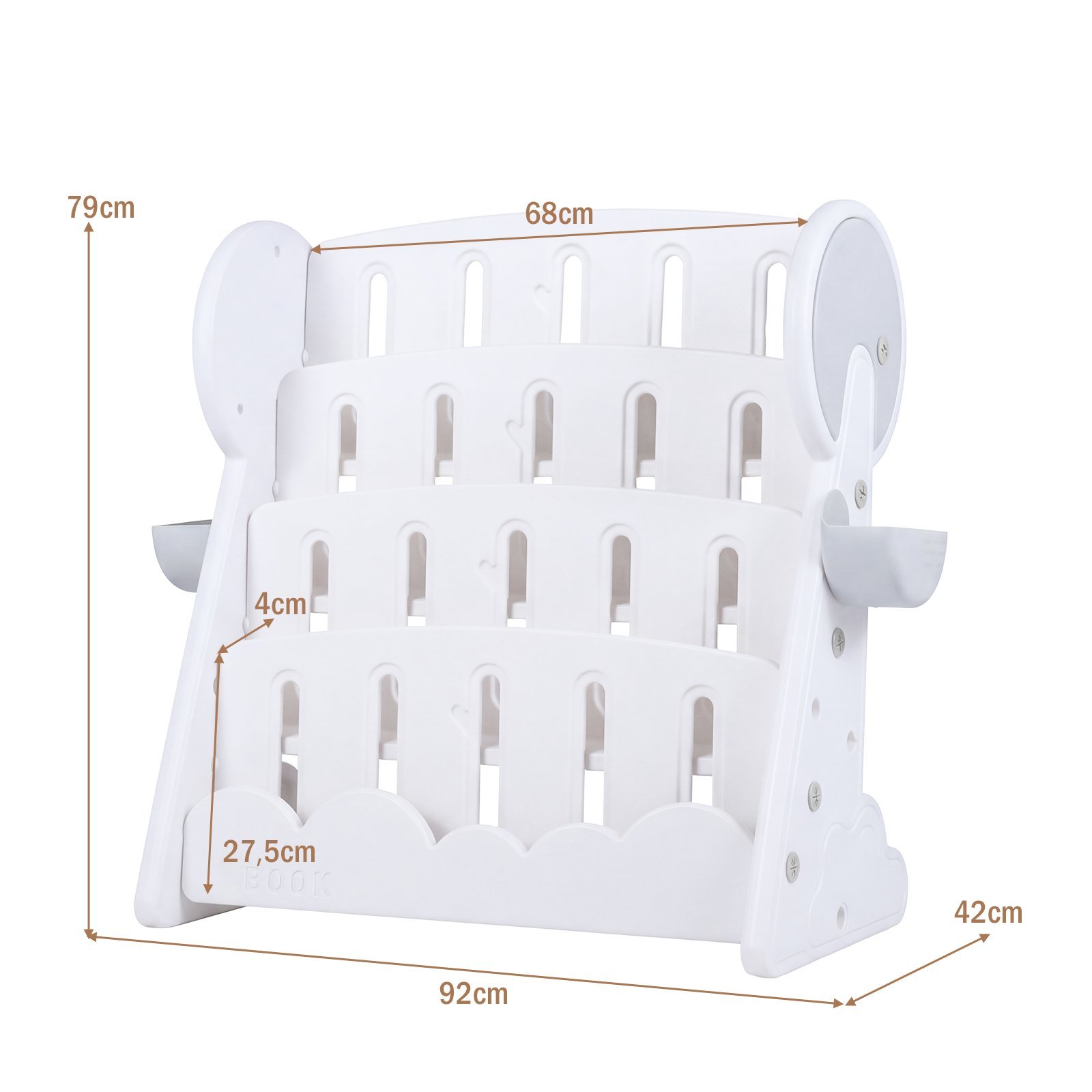 Sukurkite tvarką ir patogumą su šia keturių lygių vaikiška knygų lentyna! Ši universali lentyna ne tik pasižymi didele talpa, bet ir yra pritaikyta vaikams: suapvalinti kraštai ir stabilus trikampis pagrindas užtikrina maksimalų saugumą. 79 cm aukštis užtikrina, kad vaikai lengvai pasiektų knygas, žaislus ir kūrybos priemones, taip skatinant jų savarankiškumą ir tvarkingumą.