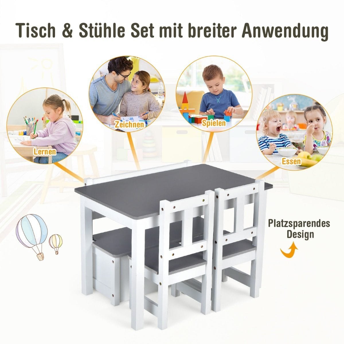 - Daugiafunkcis rinkinys: stalas, talpus suoliukas su daiktadėže ir dvi kėdės – idealu 3-4 vaikams.