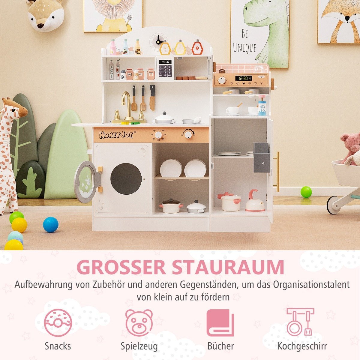 Leiskite vaikams smagiai mokytis žaidžiant su mūsų medine virtuvėle! Šis virtuvėlės žaislas sukurtas taip, kad vaikai pasinertų į kulinarinio kūrybiškumo pasaulį. Su realistiškais elementais, tokiais kaip laikrodis, mikrobangų krosnelė ir kriauklė, vaikai gali mėgautis išsamia vaidmenų žaidimo patirtimi.