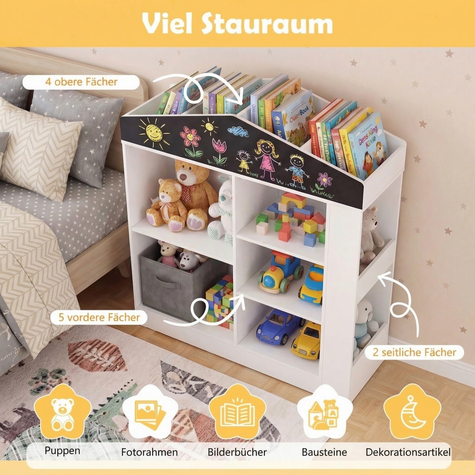 - Daugiafunkcinės lentynos ir skyreliai suteikia pakankamai vietos knygoms ir žaislams.