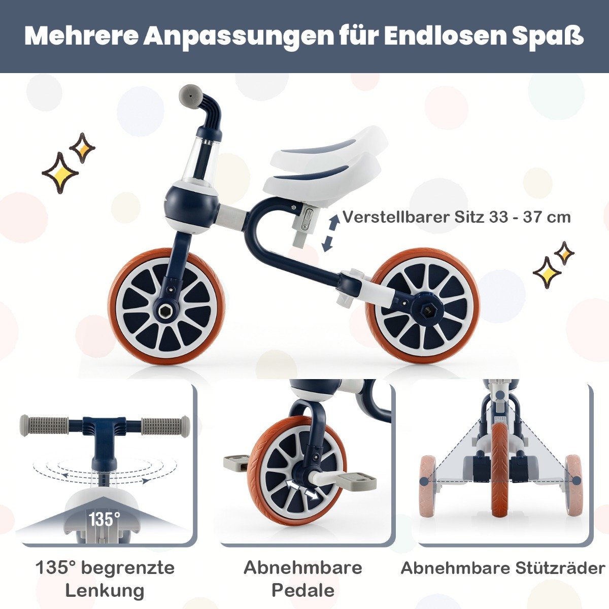 Šis universalus 4-in-1 vaikiškas dviratukas – puiki dovana jūsų 2–4 metų vaikui, sukurtas taip, kad taptų mėgstamiausia transporto priemone. Jis gali transformuotis į 4 skirtingus režimus: stumiamą dviratuką, balansinį dviratuką ir riedlentę.