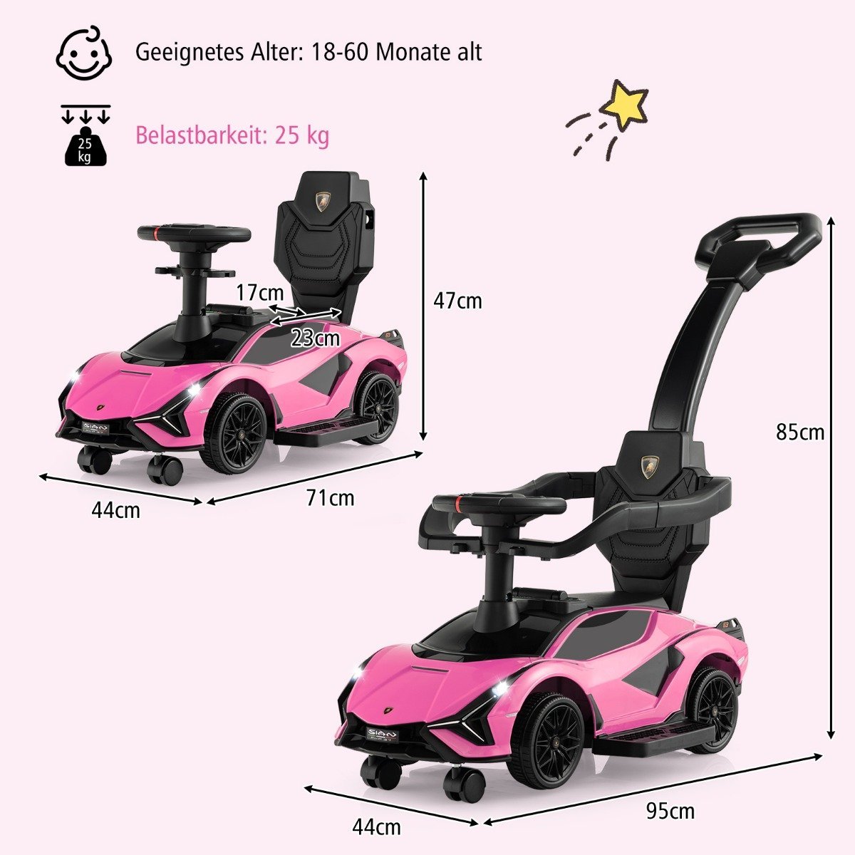 Šis licencijuotas „Lamborghini“ žaislas – idealiausia dovana jūsų mažyliui, auganti kartu su juo. Jis gali būti naudojamas kaip stumdukas (nuo 18 mėn.), automobilis stumiamas kojomis (nuo 24 mėn.) ir vaikiškas automobilis (nuo 36 mėn.).