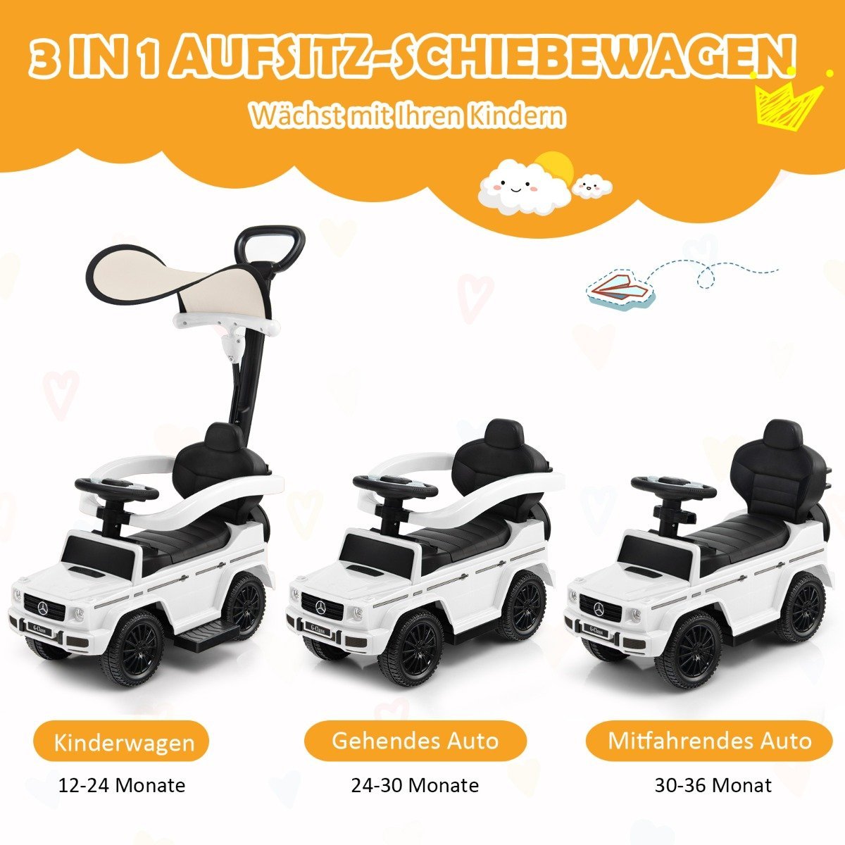 Pristatome nuostabų vaikišką automobilį, pagamintą pagal oficialią „Mercedes Benz G350“ licenciją! Šis automobilis auga kartu su jūsų vaiku, lengvai transformuodamasis iš vežimėlio su stogeliu į stumiamą automobilį ar paspiriamą transporto priemonę. Tai puikus pasirinkimas vaikams nuo 1 iki 3 metų, užtikrinantis saugią ir patogią kelionę.