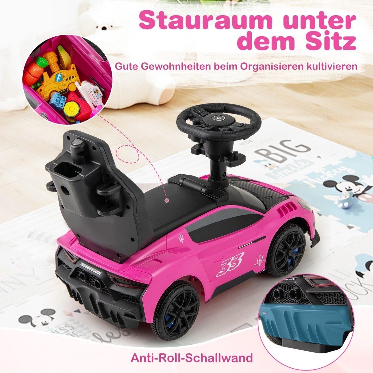 Pristatome 3-in-1 daugiafunkcinį automobilį su stūmimo rankena – puikų palydovą jūsų vaiko augimo kelionėje. Šis „Maserati“ licencijuotas žaislas derina prabangą su muzikiniu vairu, kuris groja smagias melodijas ir skatina vaiko fantaziją leidžiantis į įvairiausias keliones.