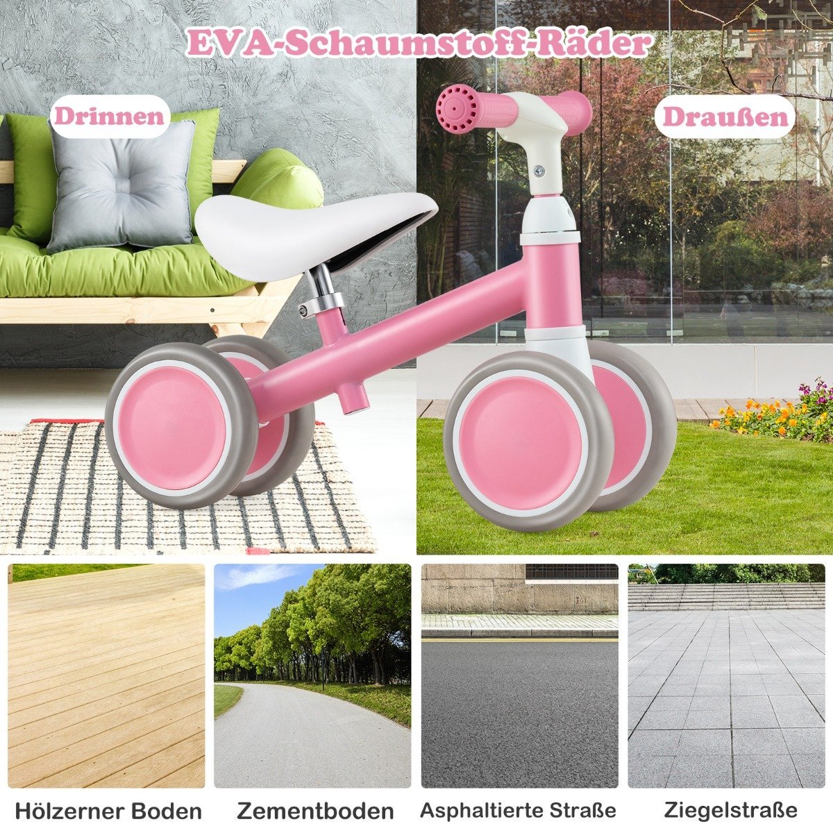 - Tvirti EVA putplasčio ratukai tinka važiuoti įvairiais paviršiais.