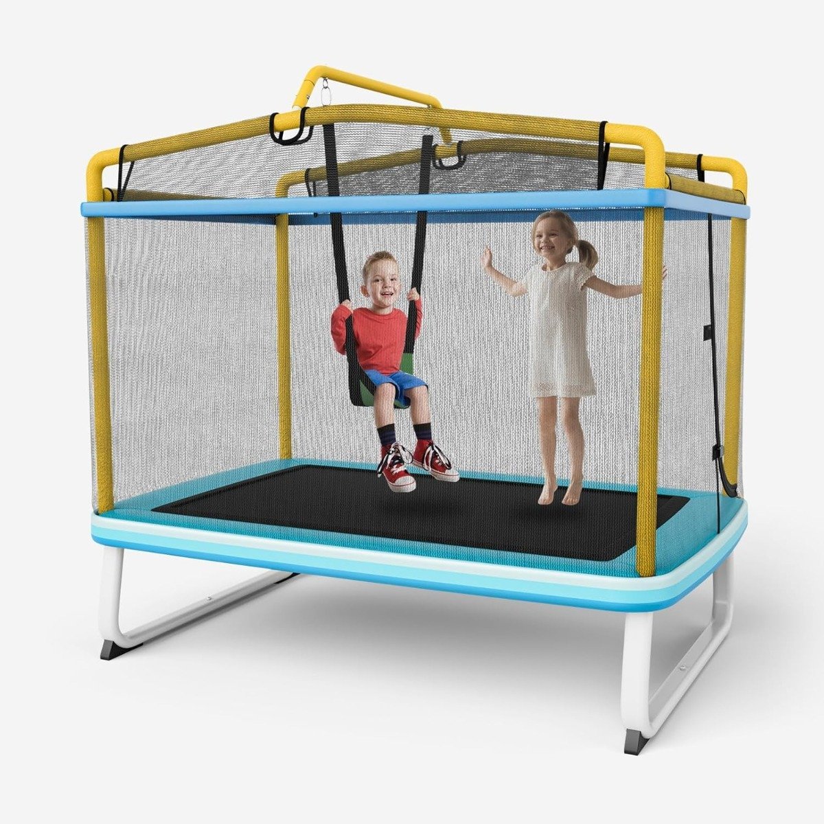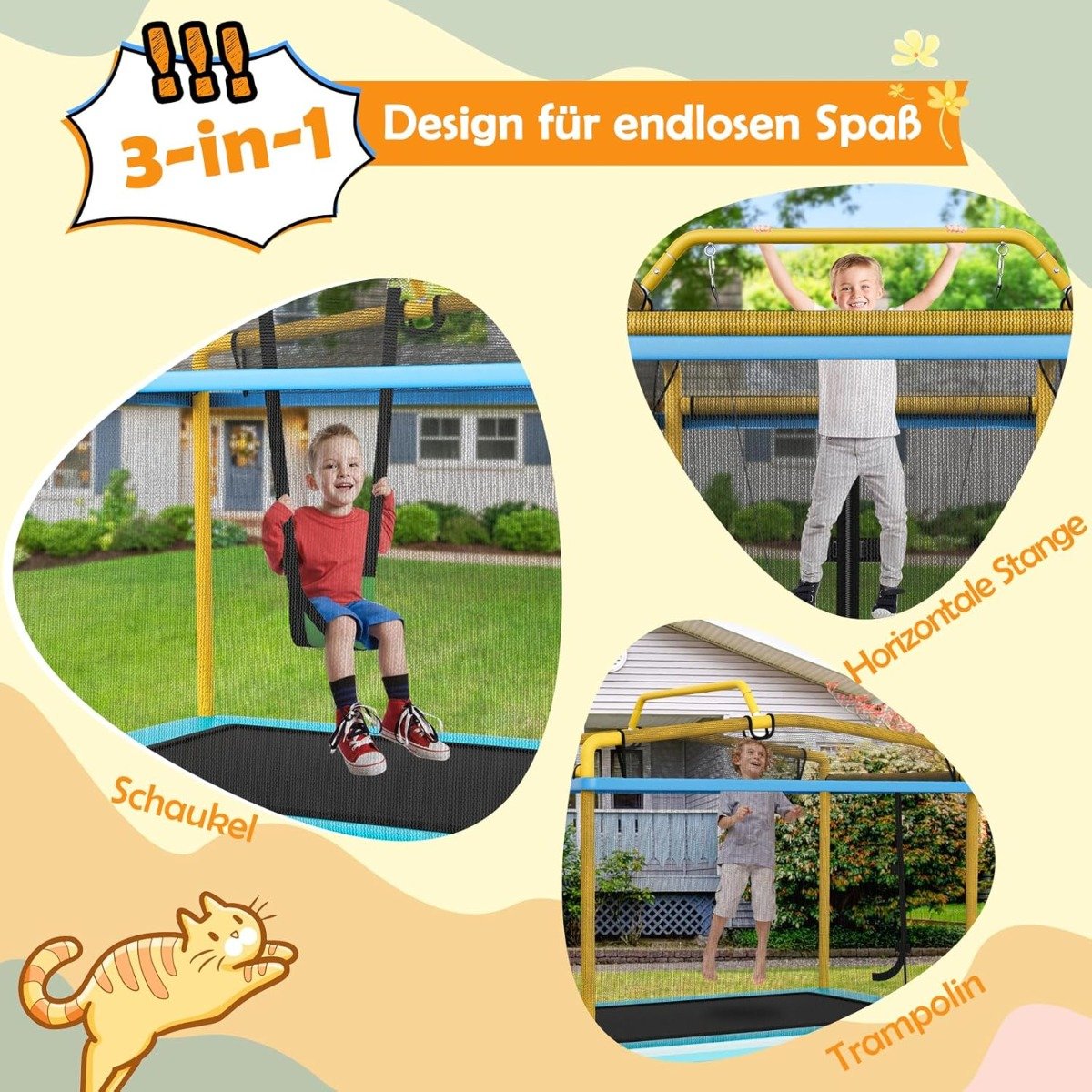 Nudžiuginkite savo vaikus šiuo universaliu 3-in-1 batutu, skirtu žaidimams lauke! Jis sujungia šokinėjimą, supimąsi ir gimnastiką, suteikdamas begalines linksmybes gryname ore. Stačiakampė forma taupo vietą ir puikiai tinka mažesniems sodams.
