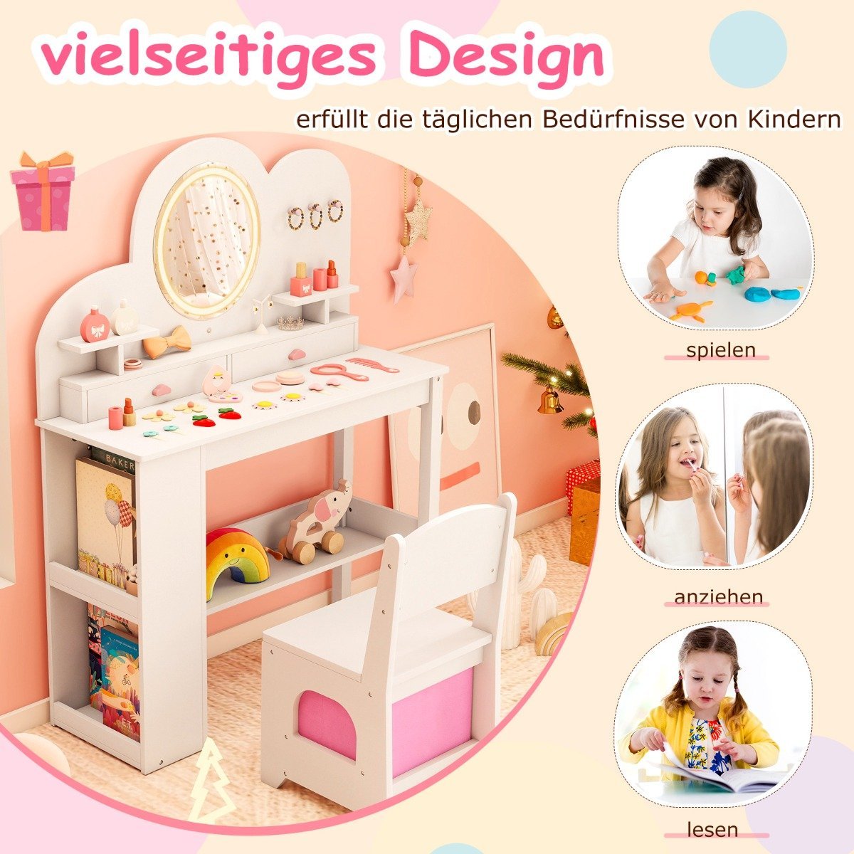 Paverskite savo vaiko kambarį magiška princesių karalyste su šiuo apšviečiamu vaikišku kosmetiniu staliuku! Veidrodis su 3 spalvų apšvietimu sukuria švelnią ir pakankamą šviesą, leidžiančią aiškiai matyti besigražinant, šukuojantis plaukus ar rengiantis. Šis komplektas su staliuku ir kėdute siūlo patogią sėdimą vietą ir gausybę vietos daiktams laikyti, puikiai tinka mažosioms princesėms nuo 3 metų.