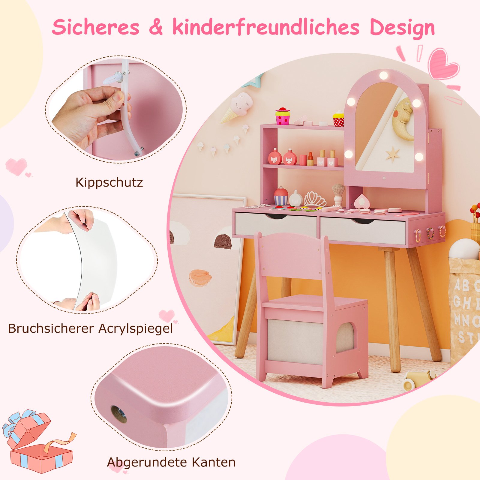 Vaikiškas kosmetinis staliukas su kėdute ir reguliuojamu 3 spalvų LED veidrodžiu (Rožinė)