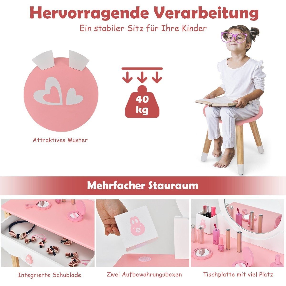 Pristatome kerintį kosmetinį staliuką su kėdute, sukurtą specialiai mažosioms princesėms. Šis baldas ne tik suteiks daug džiaugsmo, bet ir padės ugdyti tvarkos įgūdžius. Elegantiškas dizainas su žavingomis detalėmis akimirksniu patrauks vaiko dėmesį.