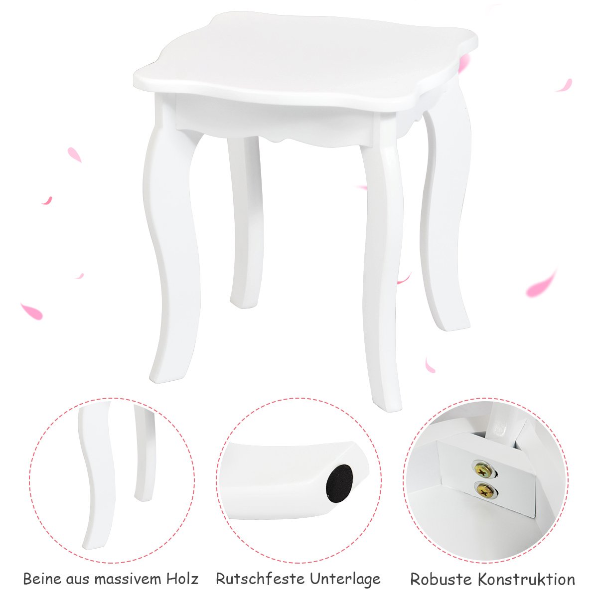 - Daugiafunkcis 2-in-1 dizainas: veidrodėlį galima nuimti, todėl staliukas lengvai virsta rašomuoju stalu.