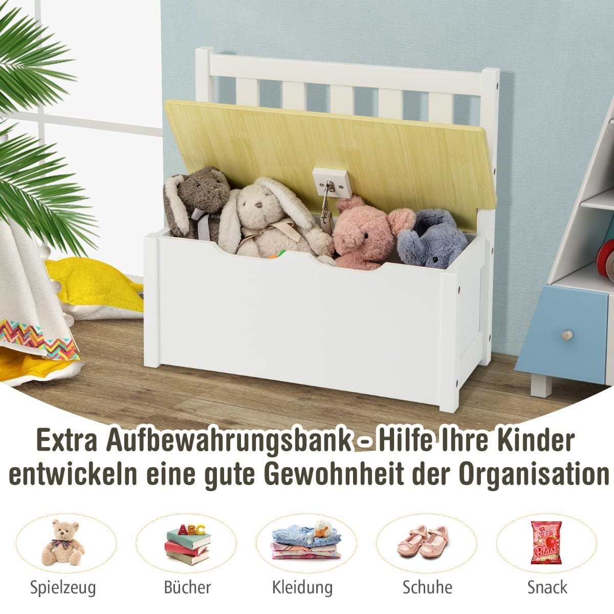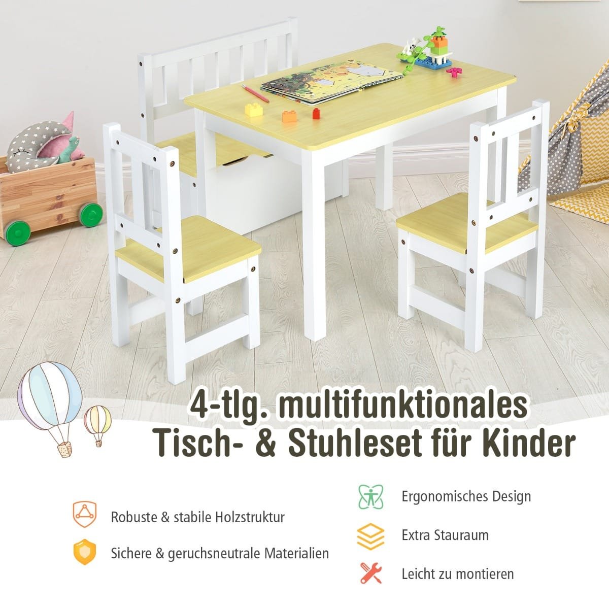 Sukurtas Lietuvos rinkai, šis 4 dalių medinis vaikiškų baldų komplektas yra puikus sprendimas jūsų mažyliui. Jį sudaro stalas, dvi patogios kėdutės ir talpus suoliukas su paslėptu daiktadėže, skatinantis kūrybiškumą ir užtikrinantis komfortą.