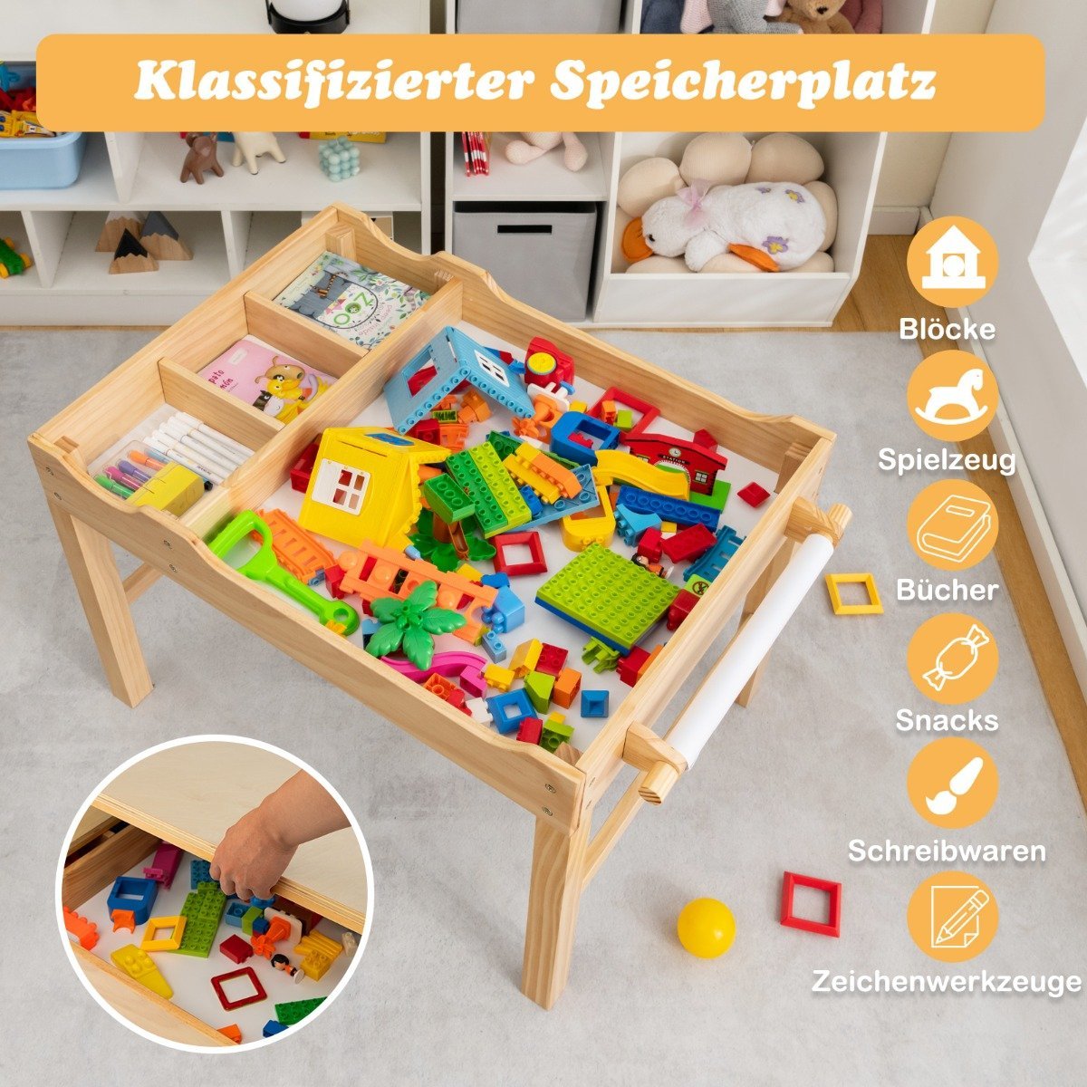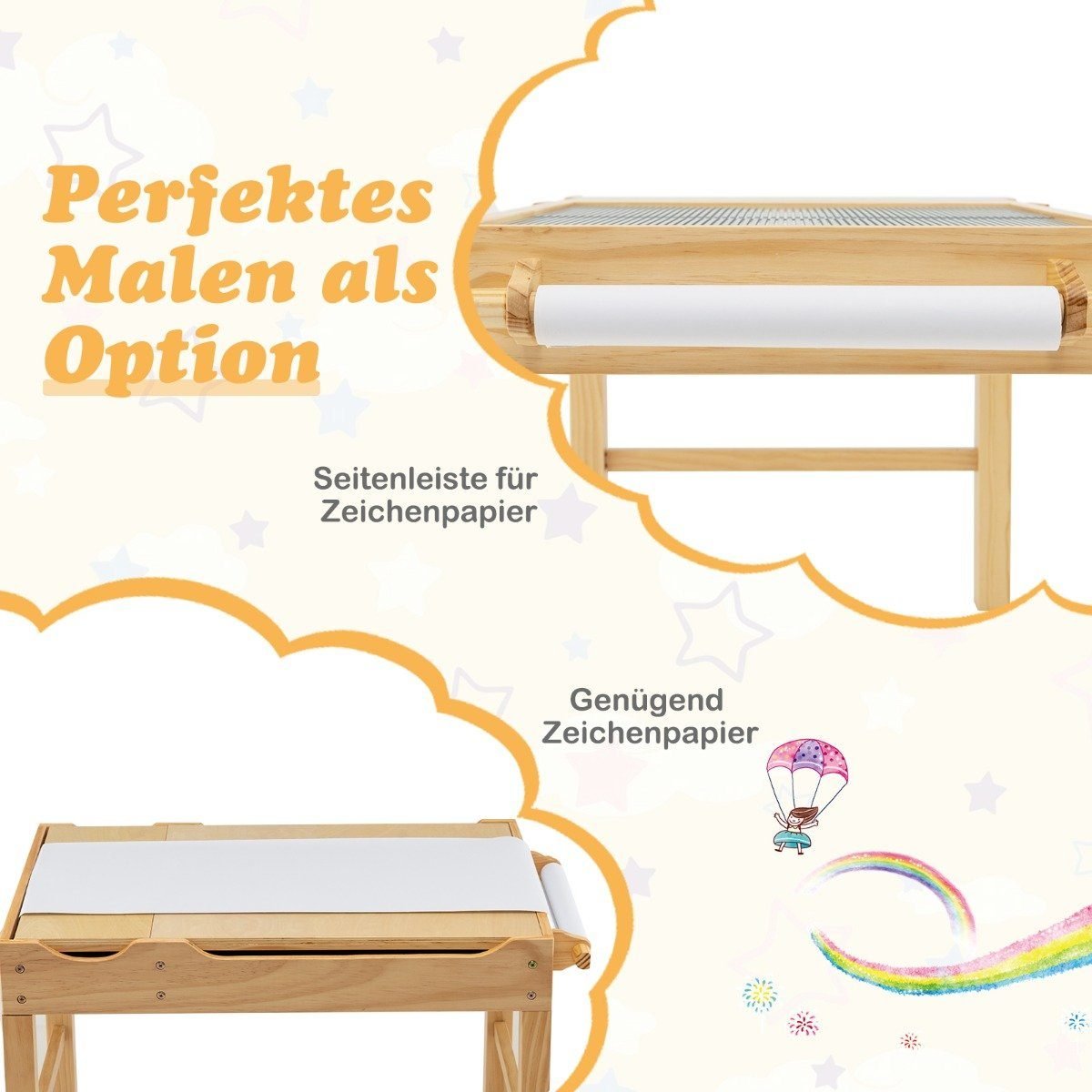 - Integruota daiktadėžė ir popieriaus ritinėlis: leidžia vaikams tvarkingai laikyti žaislus ir kūrybines priemones.