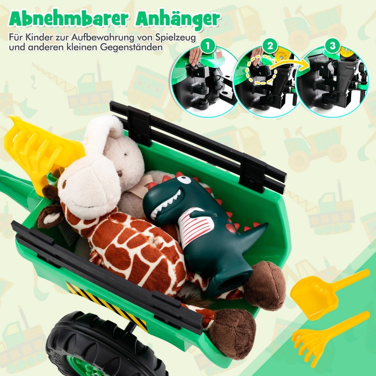 - Nuimama priekaba: skirta žaislams ir smulkiems daiktams laikyti bei patogiam transportavimui.