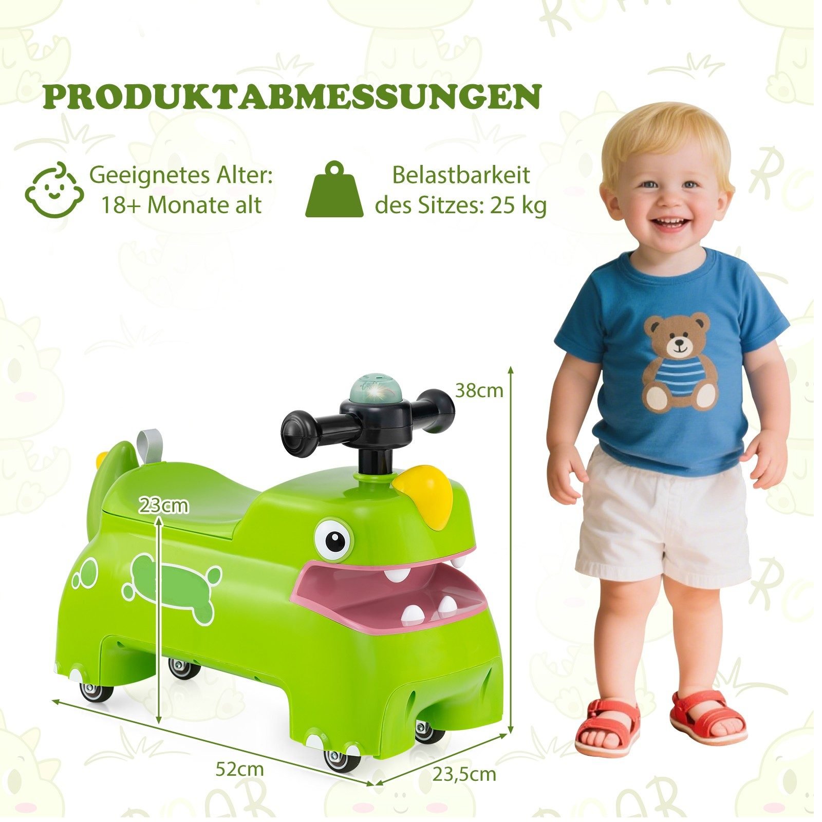 - Interaktyvus žaidimas: 6 garsai, mirksinčios LED lemputės ir spaudžiami dantukai suteikia daugybę linksmybių.