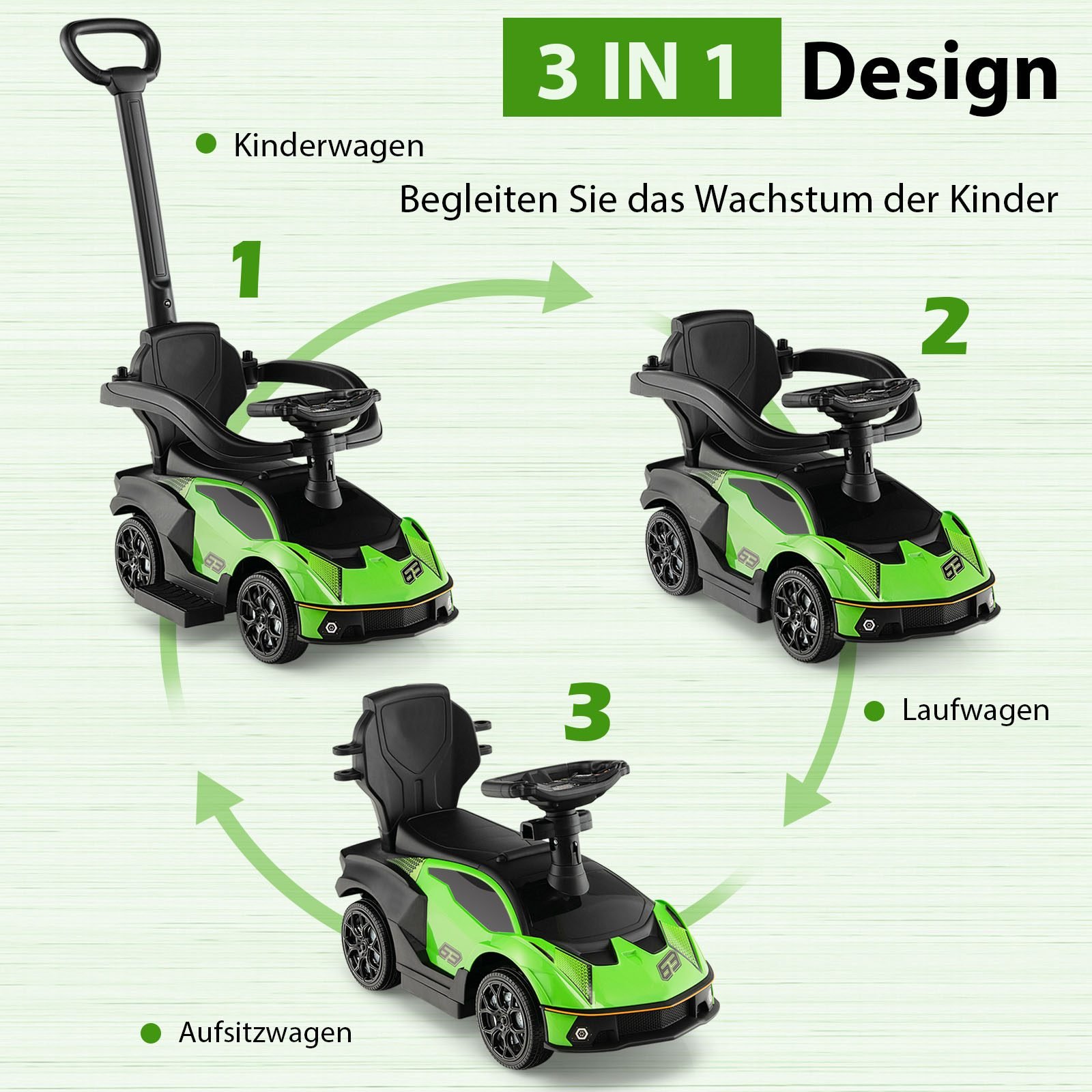 Daugiafunkcis 3-in-1 paspiriamasis automobilis – puikus pasirinkimas jūsų mažyliui! Šis universalus žaislas gali būti pritaikytas pagal vaiko amžių ir poreikius: jis gali būti naudojamas kaip atraminis vežimėlis, paspiriamasis automobilis arba stumiamas su tėvų pagalba. Žaislas lavina vaiko motorinius įgūdžius ir koordinaciją, o patogi rankena leidžia tėvams lengvai stumti vaikelį.