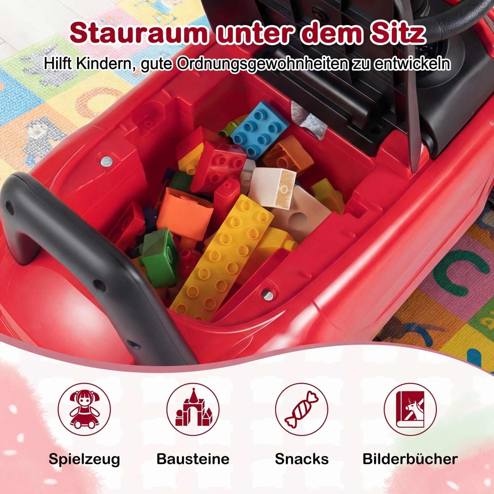 - Patogi daiktadėžė po sėdyne, puikiai tinkanti žaislams ir užkandžiams laikyti.