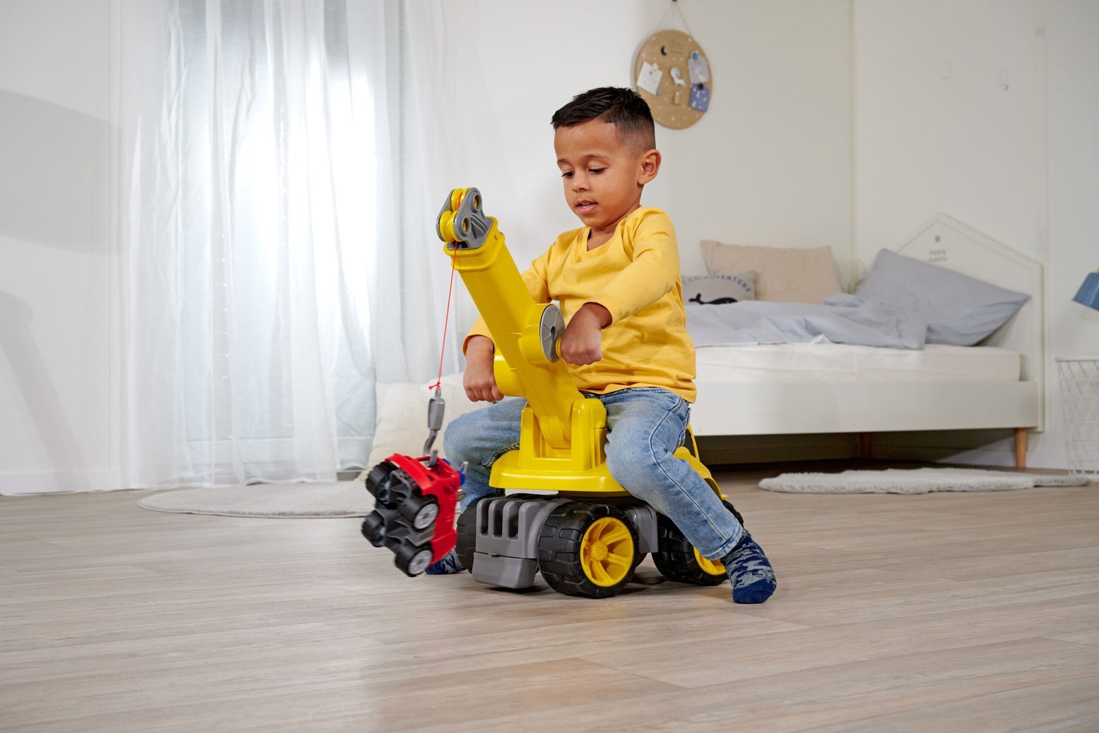 Šis žaislas sukurtas atsižvelgiant į mažiausiųjų saugumą. Paspirtukas turi didelę, patogią sėdynę. Kranas sukasi 360 laipsnių aplink vertikaliąją ašį ir gali saugiai pakelti daiktus, sveriančius iki 450 g.