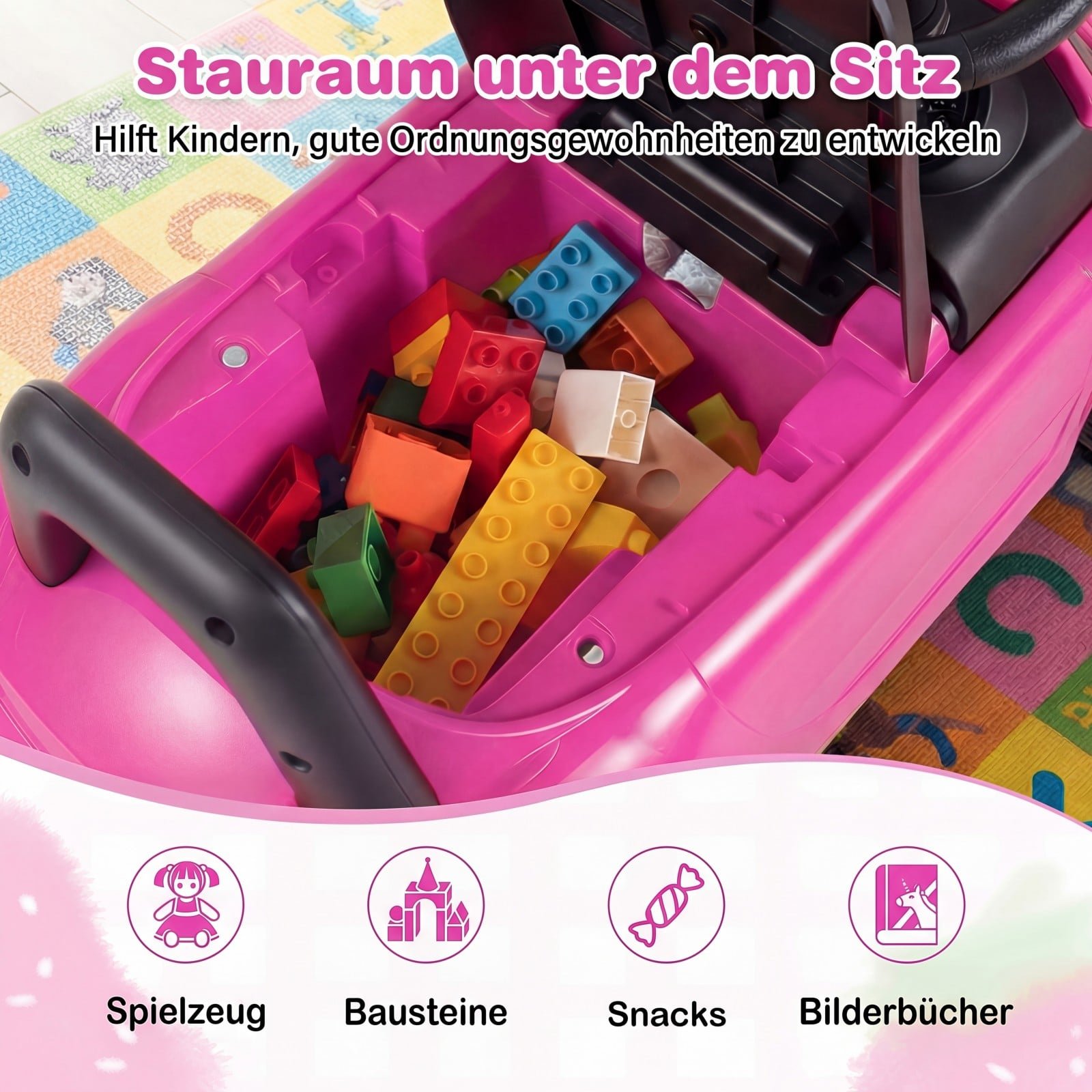 - Integruota daiktadėžė po sėdyne žaislams ir užkandžiams.