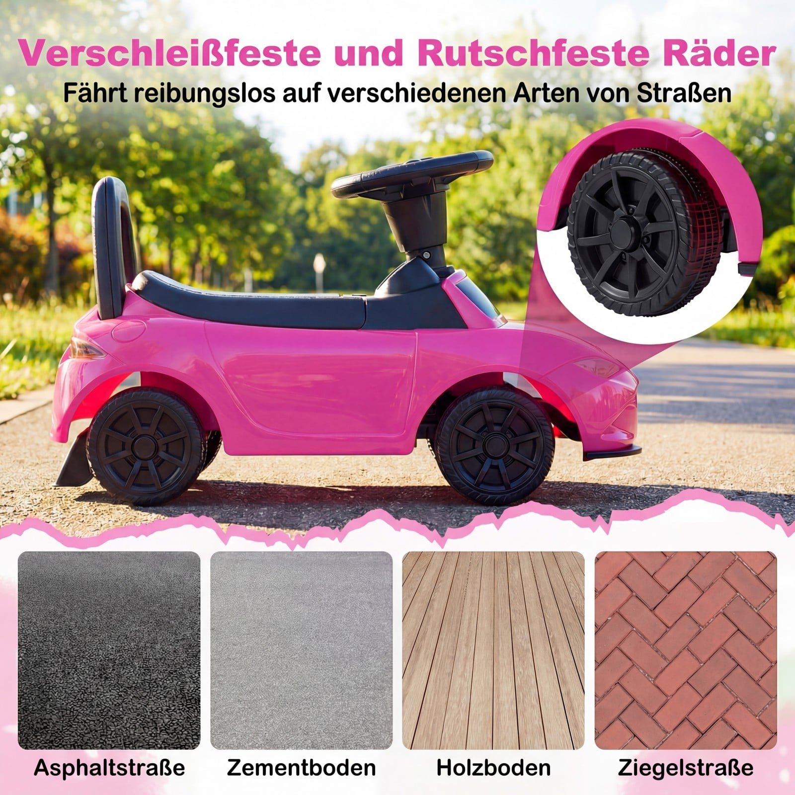 - Patvarūs, neslystantys ratai tinka įvairiems paviršiams.