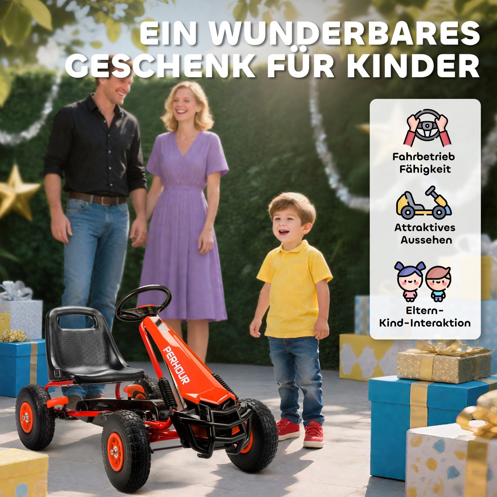 Šis vaikiškas kartingas turi reguliuojamą, augančią sėdynę ir plačias EVA padangas, užtikrinančias sklandų slydimą visais paviršiais. Su tikroviškais valdymo elementais, tokiais kaip stabdžiai ir pavarų svirtis, šis minamas automobilis kiekvieną išvyką pavers jaudinančiu nuotykiu.
