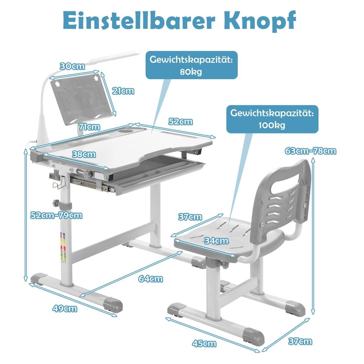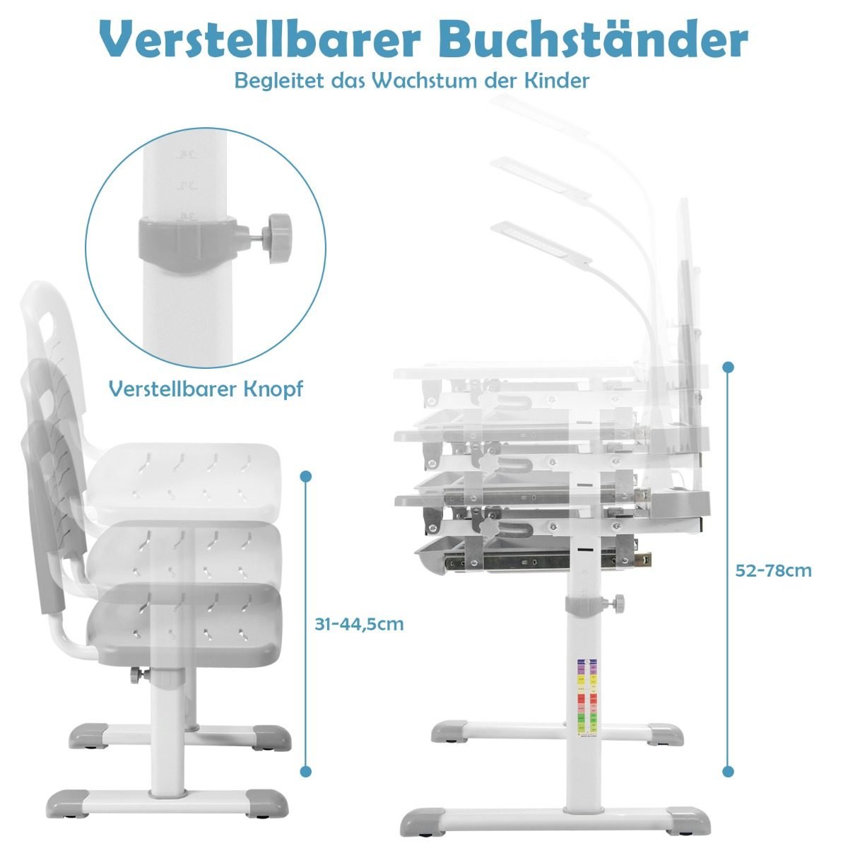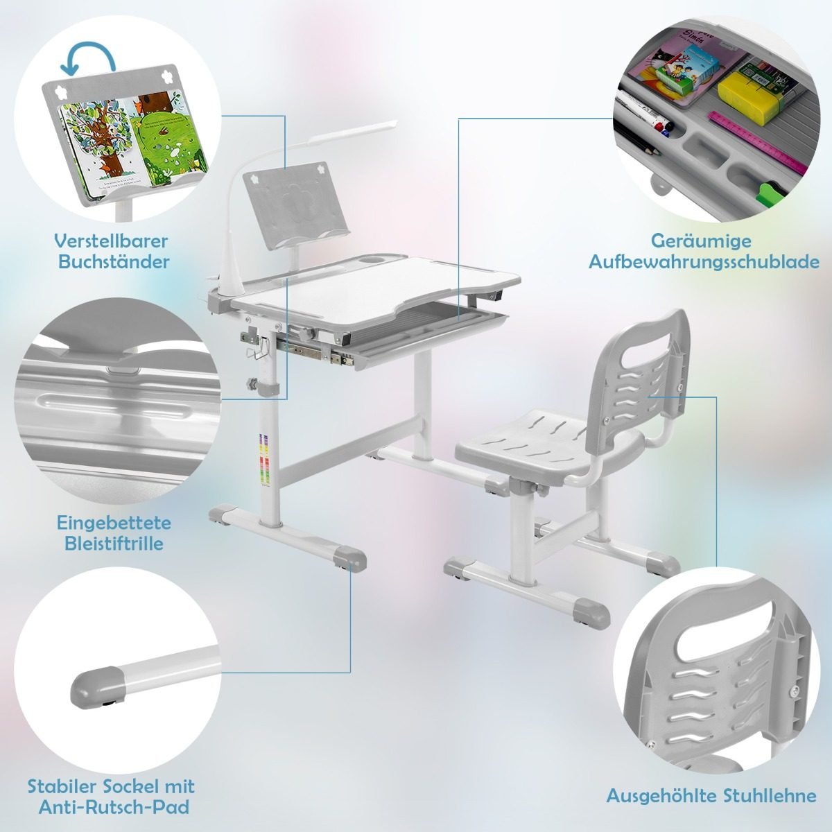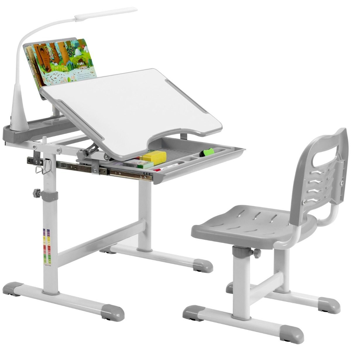 Vaikiškas rašomasis stalas su LED lempute ir knygų lentyna (Pilka)