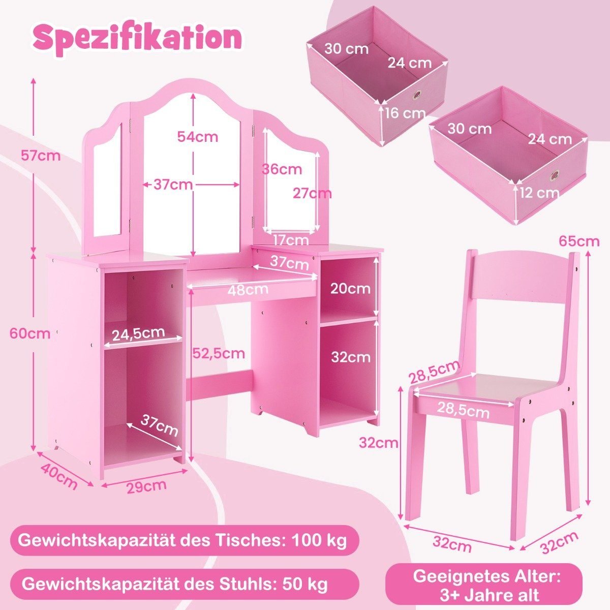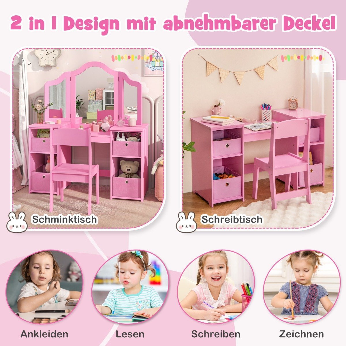 Vaikiškas rašomasis stalas su veidrodžiu ir laikymo dėžėmis (Rožinė)