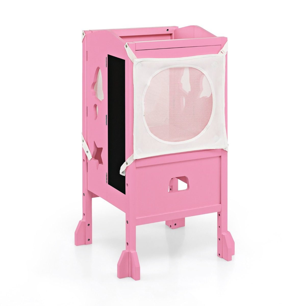 Vaikiškas reguliuojamo aukščio stovėjimo paaukštinimas su saugos tinklu (Rožinė)