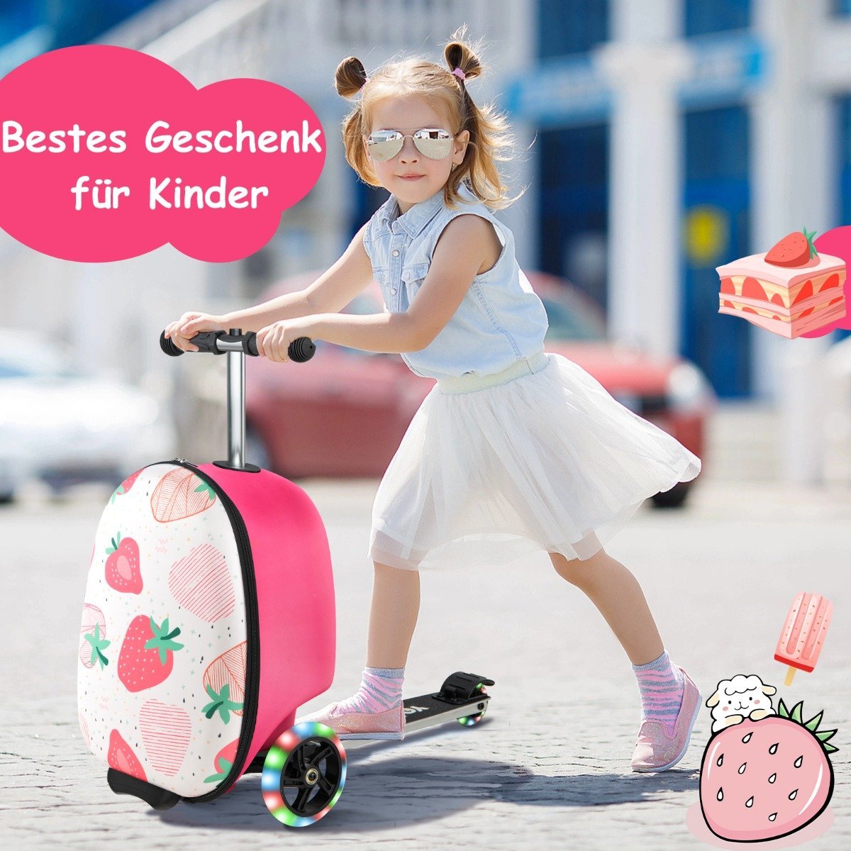 Vaikiškas riedlentės formos lagaminas su LED ratukais ir stabdžiais (Rožinė)
