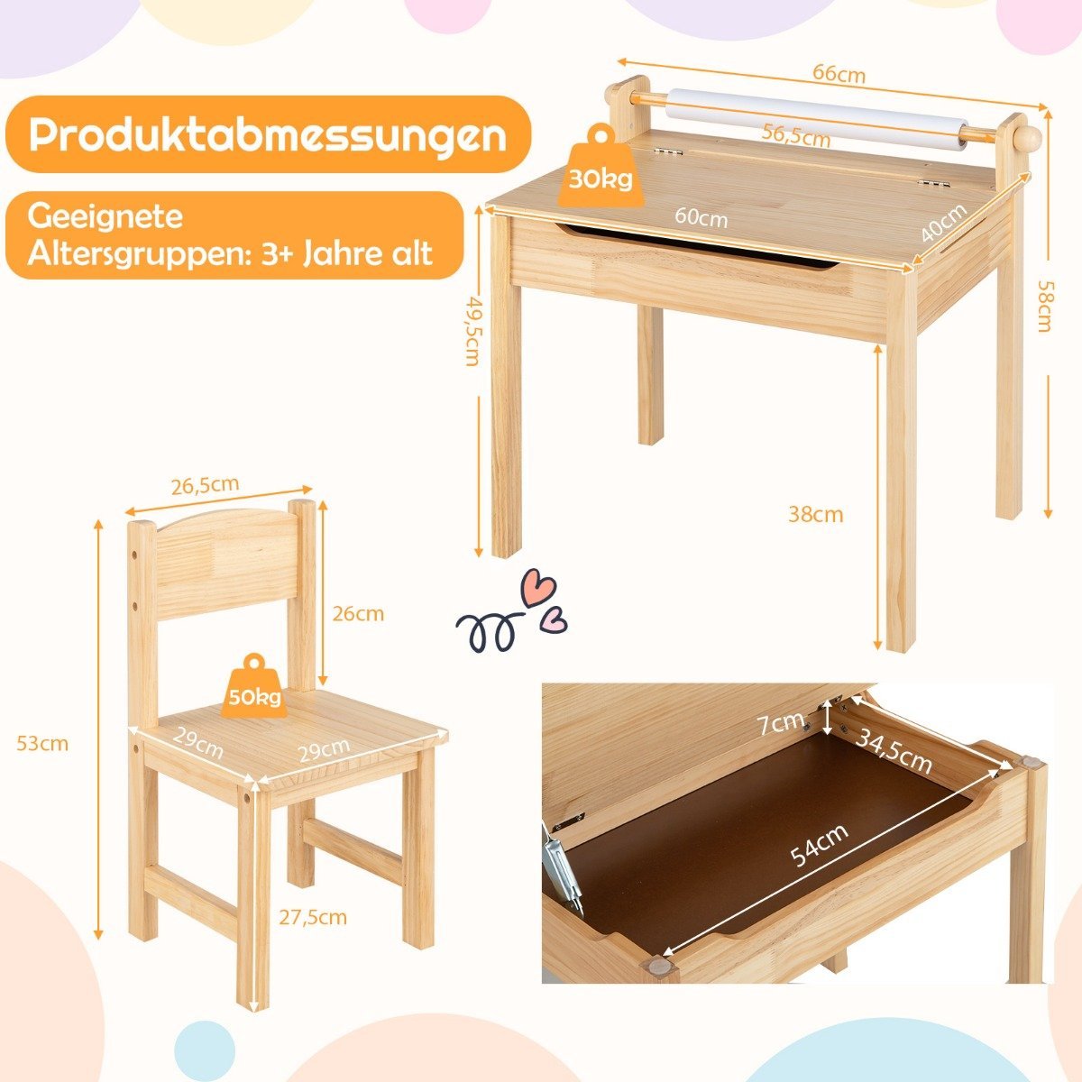 Dovanokite vaikui kūrybos ir žaidimų erdvę su šiuo universaliu stalo ir kėdės komplektu! Sukurtas atsižvelgiant į mažųjų poreikius, šis rinkinys skatina ugdyti organizuotumo įpročius ir suteikia patogią vietą piešti, mokytis, žaisti ar valgyti.