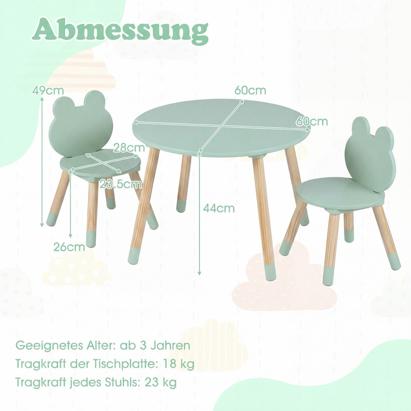- Į komplektą įeina 1 stalas ir 2 kėdės su žaismingais varlytės formos atlošais.