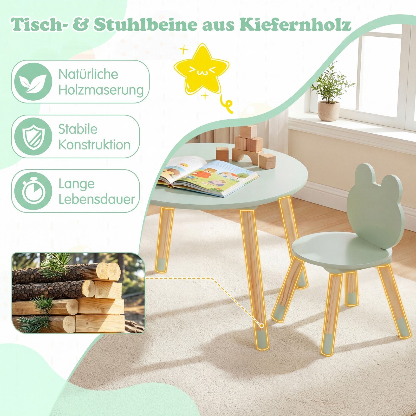 Sukurkite jaukią ir žaismingą erdvę vaikams su šiuo stalo ir kėdžių komplektu. Kruopščiai suprojektuotas su užapvalintais kraštais ir tvirtomis jungtimis, šis komplektas užtikrina saugumą ir stabilumą kasdieniam naudojimui. Pagamintas iš tvirtos pušies medienos, jis pasižymi natūraliu grožiu ir ilgaamžiškumu, idealiai tinkančiu vaiko poreikiams.