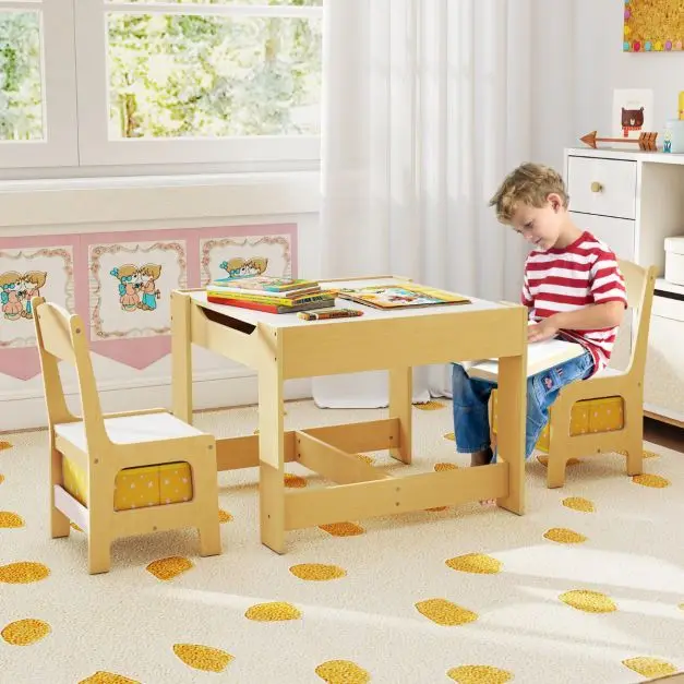 Mūsų vaikiškas stalo ir dviejų kėdučių komplektas yra puiki dovana mažiesiems! Šis universalus vaikiškų baldų komplektas skatina skaitymą, rašymą ir piešimą. Jis turi dvipusį stalviršį: viena pusė yra lenta, kita – rašomoji lenta, idealiai tinkanti kūrybinėms veikloms. Papildoma daiktadėžė po stalviršiu ir 2 medžiaginiai stalčiai padeda palaikyti tvarką kambaryje.