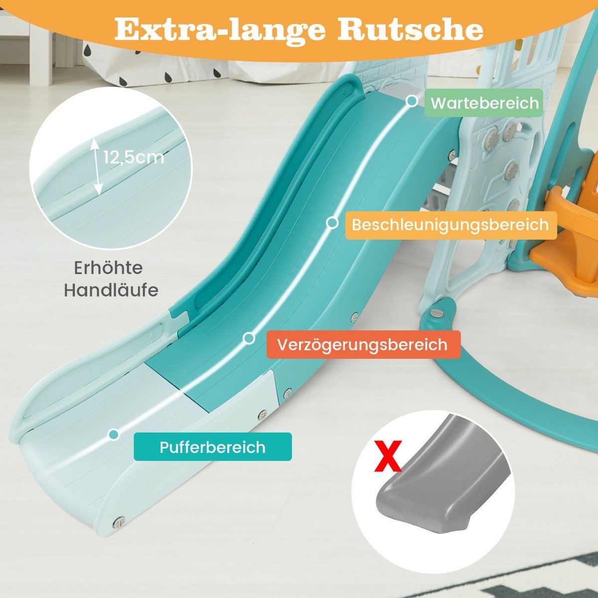 - Prailginta čiuožykla su apsaugomis: čiuožykla turi specialias zonas ir paaukštintus kraštus, užtikrinančius saugumą ir papildomą malonumą.